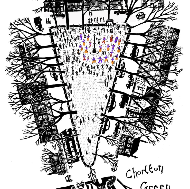 A celebration of Chorlton-cum-Hardy’s historic centre, flanked by the Lychgate, The Horse and Jockey PH, The Beech PH, the former Victorian school and Zetland Terrace.