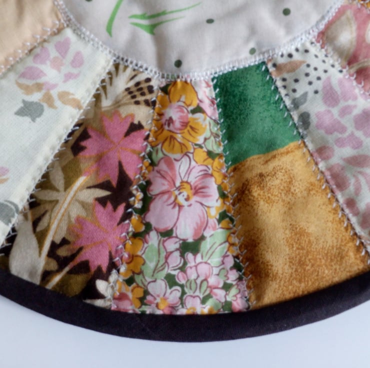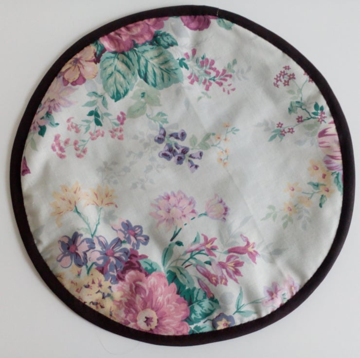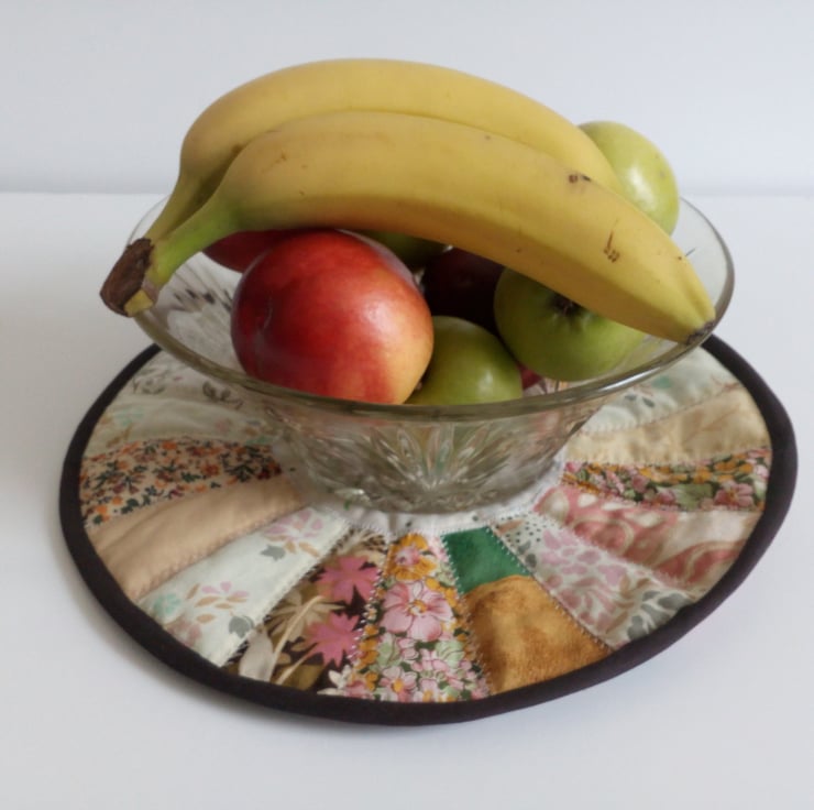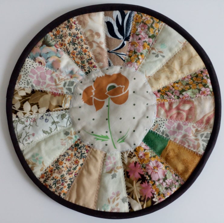 This is a round patchwork & quilted tablemat. It can be used as a placemat or table centrepiece. It measures approx 32cm in diameter. It has a brown bias binding edging and is in a brown/beige theme. It is backed in a floral design fabric. It is made from a variety of fabrics mostly cottons.