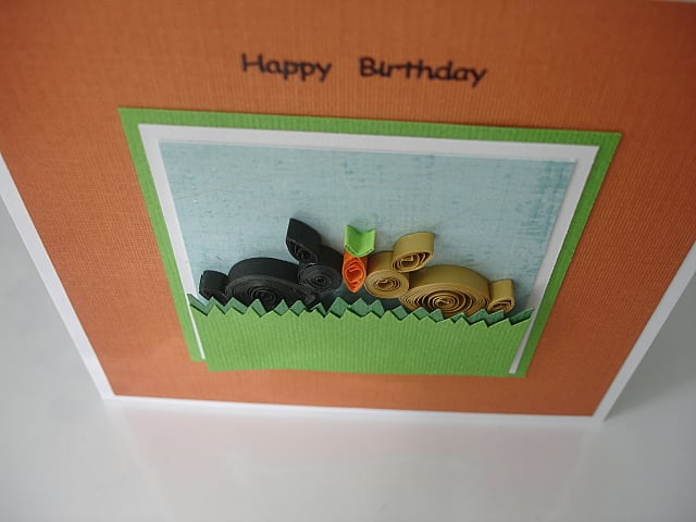 There are two hand-quilled rabbits – one black and one brown – sharing a carrot in the spirit of friendship.