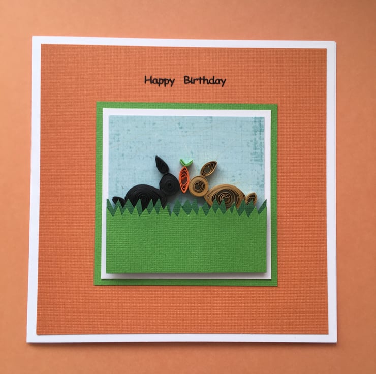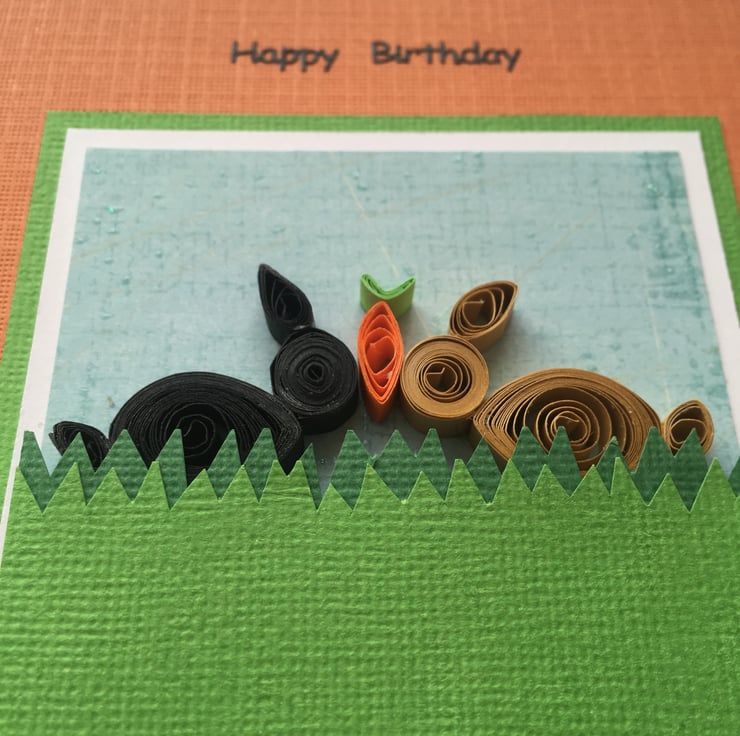 There are two hand-quilled rabbits – one black and one brown – sharing a carrot in the spirit of friendship.