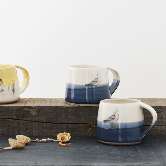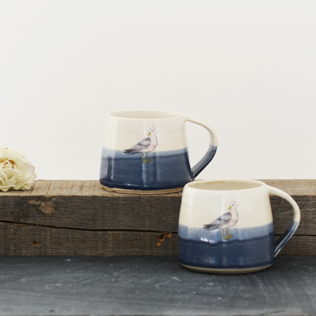 A lovely mug hand-thrown by Mecki of superior quality white stoneware clay and glazed in blue and white with our own glazes. The picture of the seagull was drawn by Zanna. Fired into the glaze at 850 degrees C, it has fused right into the mugs and will not fade over time.