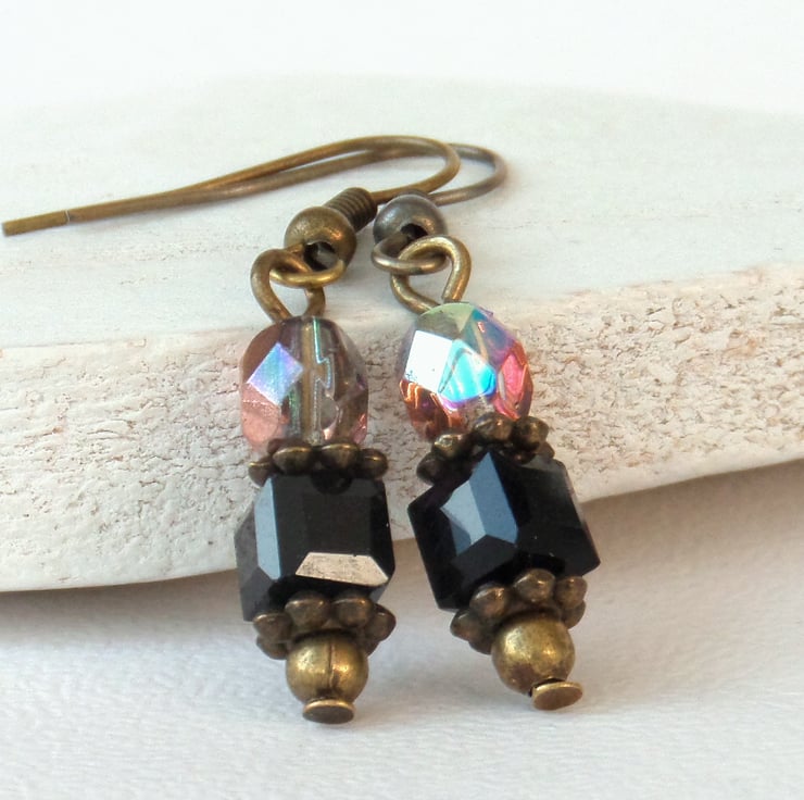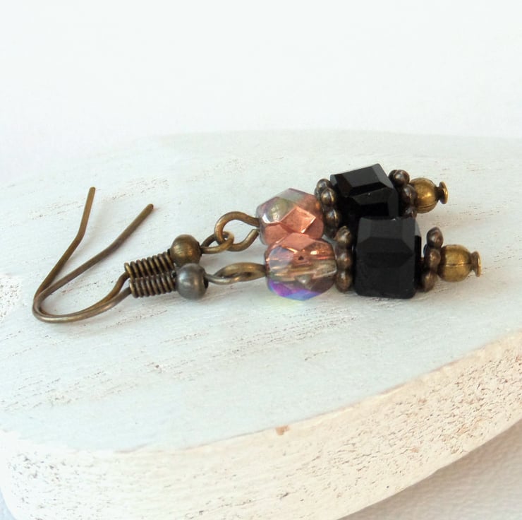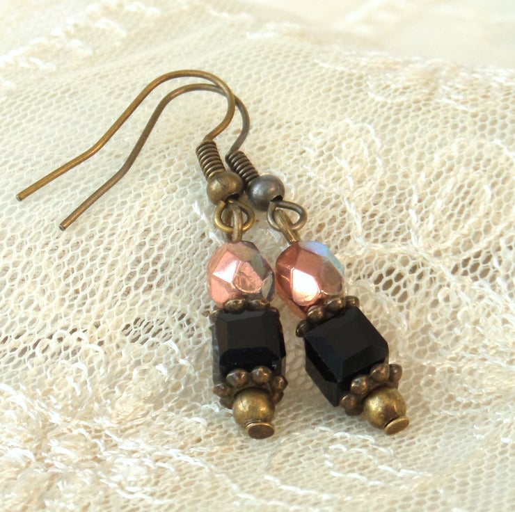 A dainty pair of earrings, with black crystal cubes and half copper coated crystals.
