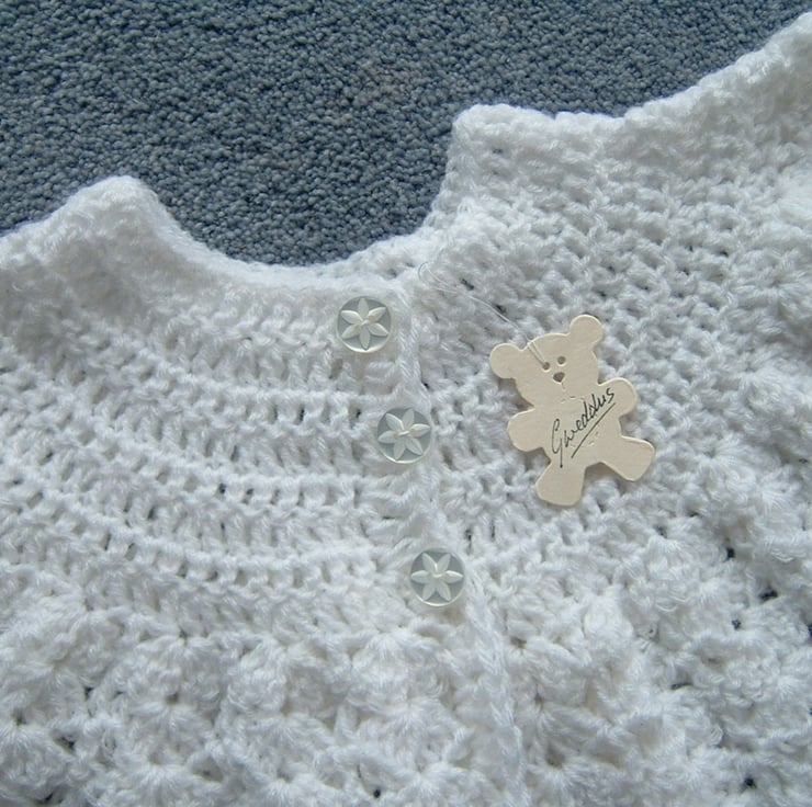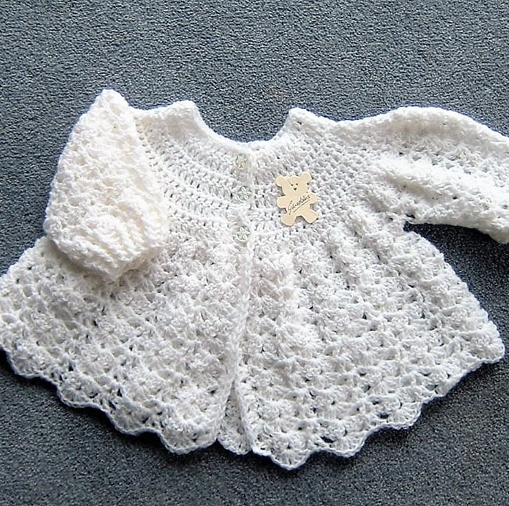 This beautiful hand crocheted matinee coat has been created to my own design and pattern.