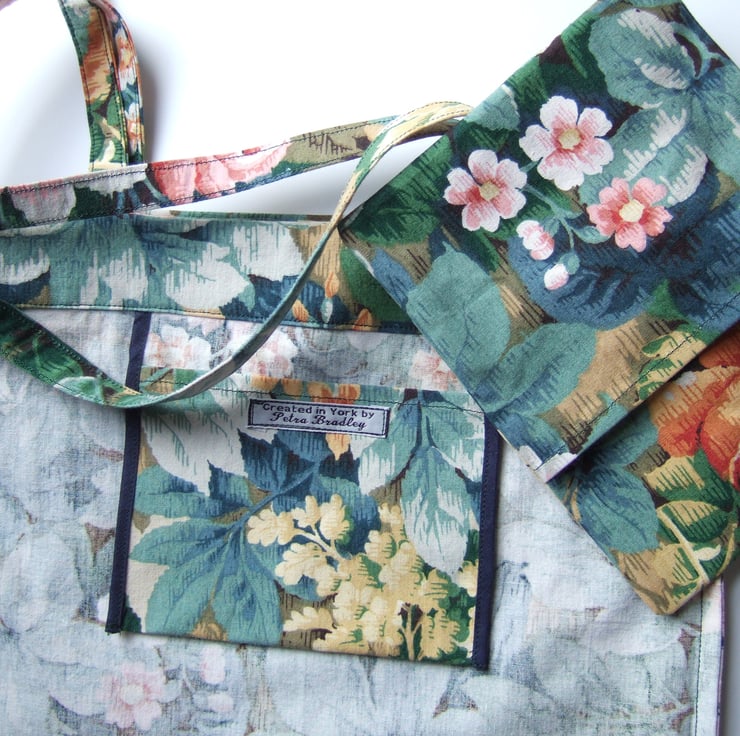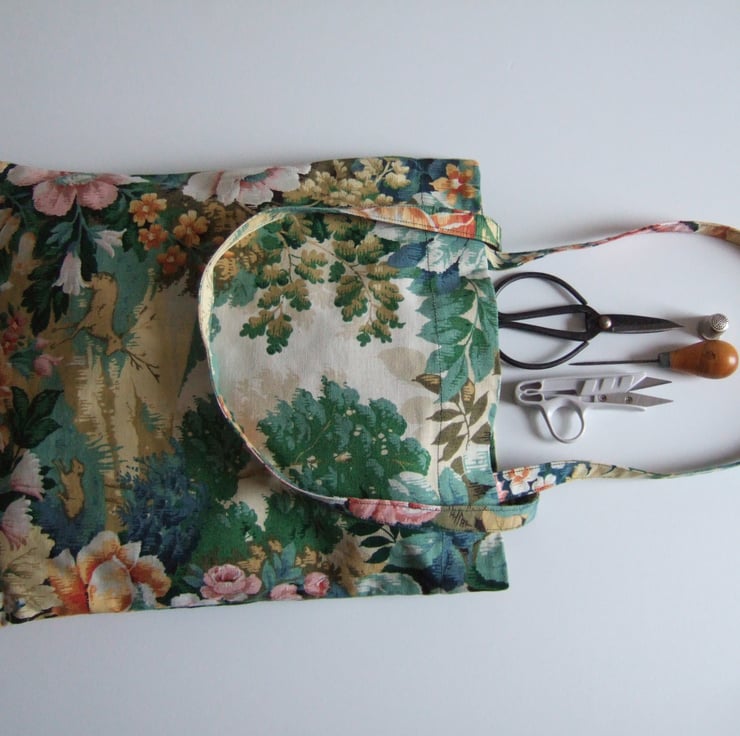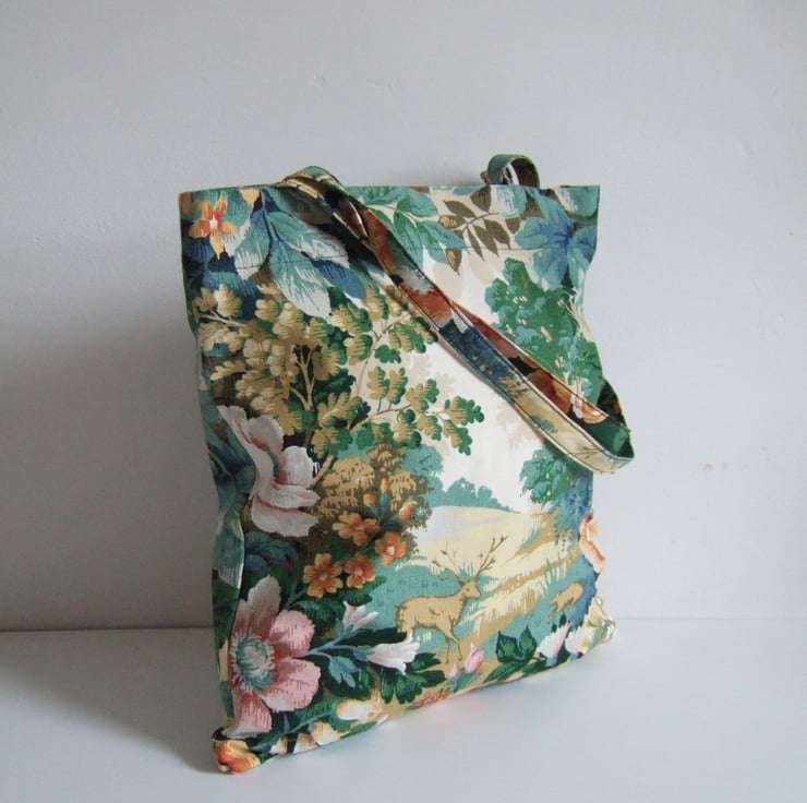 Peer into the magical Sanderson glen which adorns the front of this sturdy little bag. Made from a lovely piece of vintage furnishing fabric, it has a pretty woodland scene to the front, and a full blown floral motif to the back.