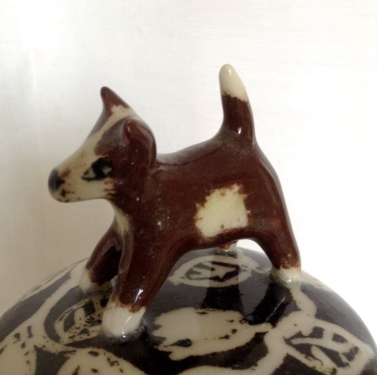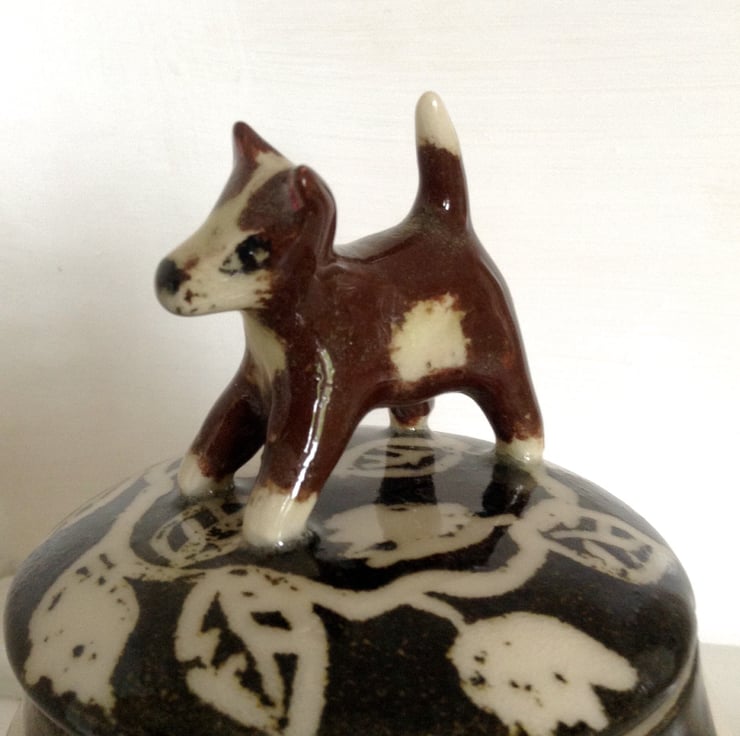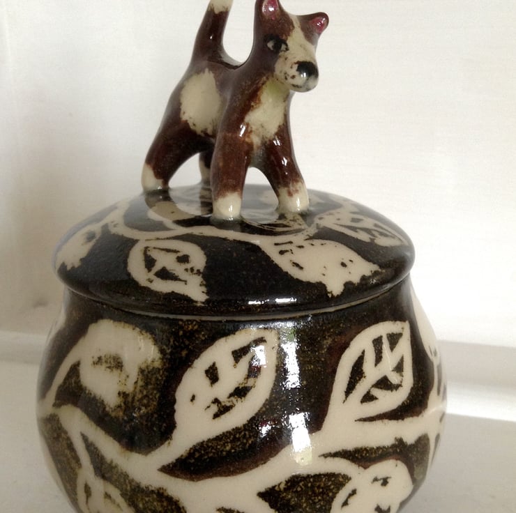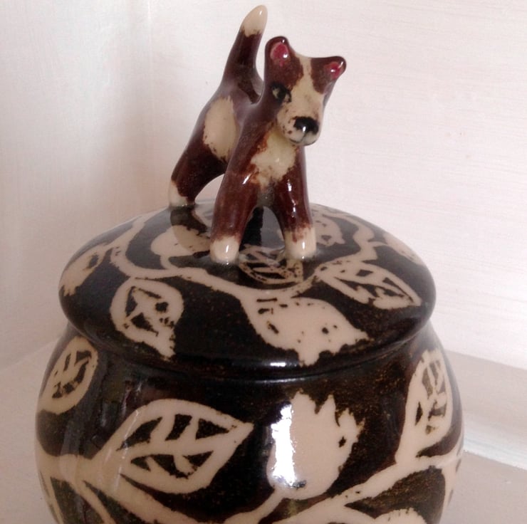 Charming stoneware storage jar in brown and cream with a little terrier dog on the lid. The jar is hand thrown and decorated with a simple chain of leaves and the little dog is lovingly hand sculpted. It measures 15 cms high x 10.5 cms wide.