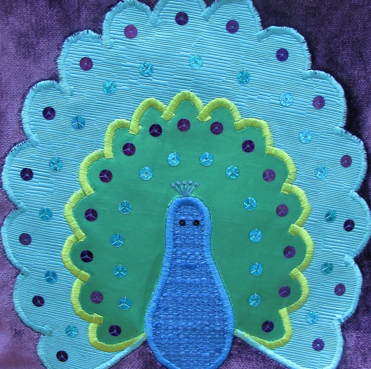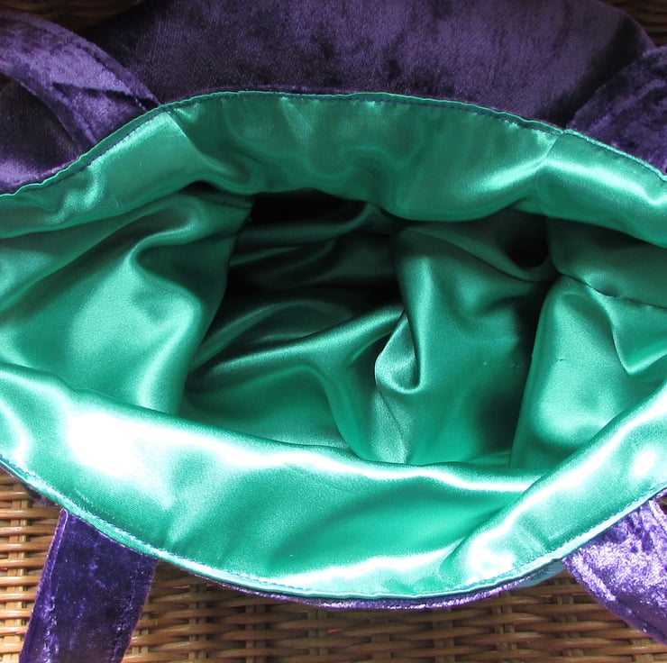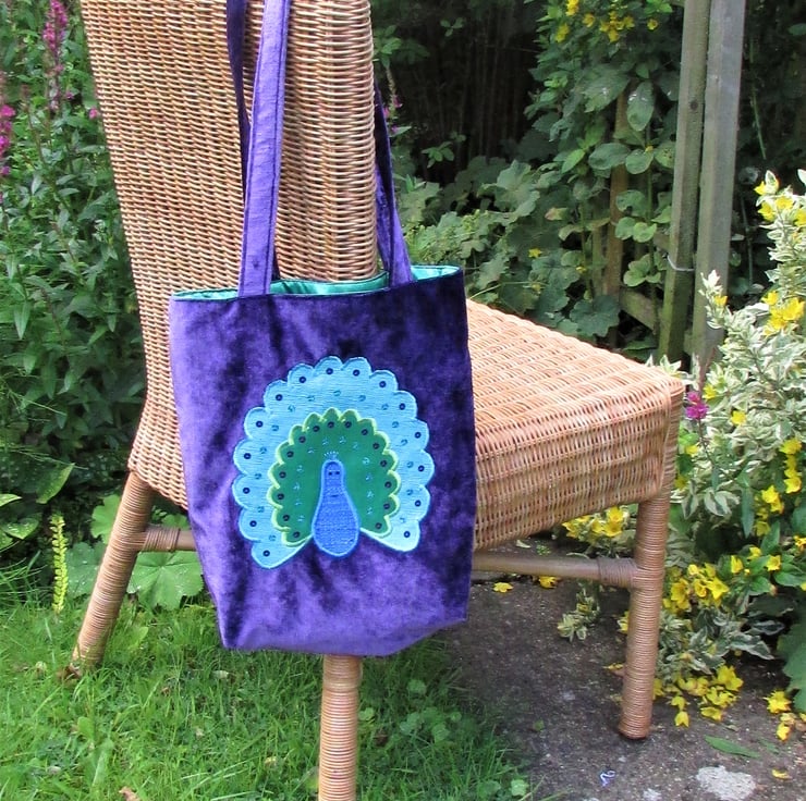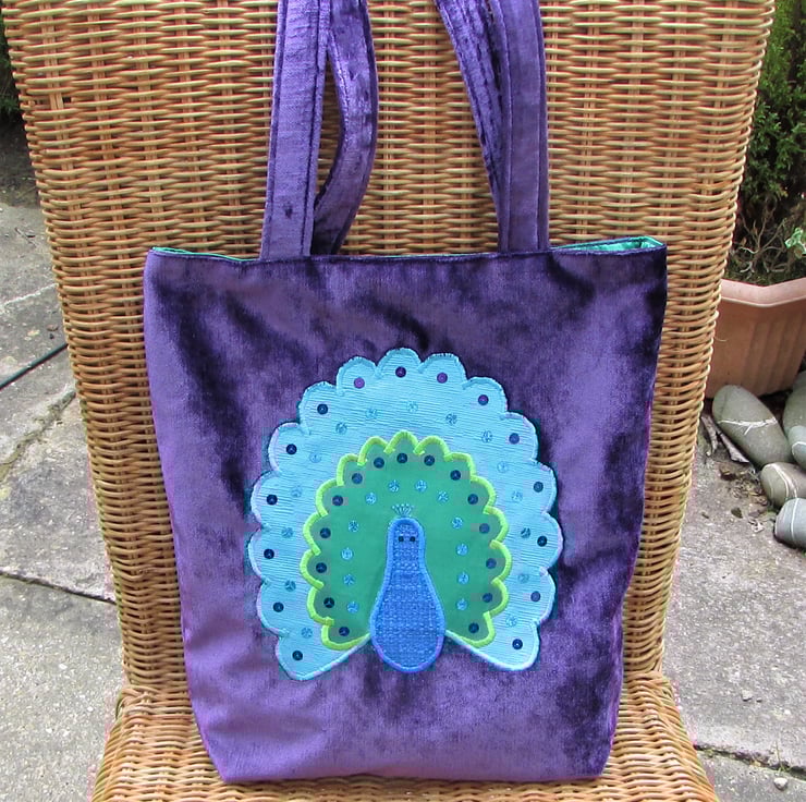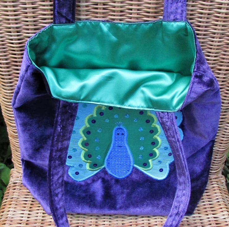 A luxurious peacock tote bag in purple velvet fabric with a striking applique peacock. The peacock has a body of bright blue woven fabric and an open tail made of green satin and turquoise textured satin fabric. The tail is embellished with purple and turquoise holographic sequins. The peacock's eyes are two tiny black sequins and the crest on top of the head has been hand embroidered with straight stitches and french knots. The bag is fully lined with the same green satin fabric as that on the peacock's tail.