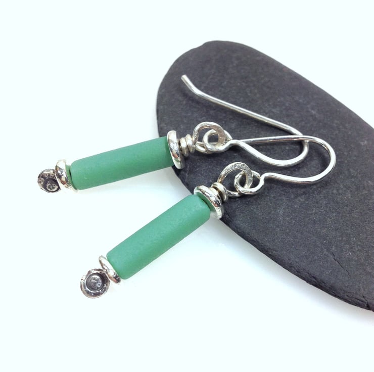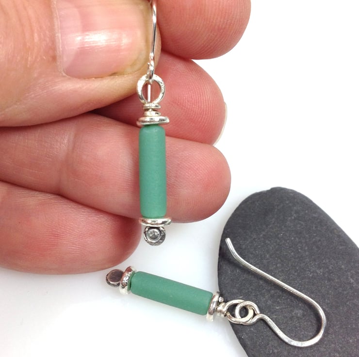 Forged sterling silver pins have been threaded through 5mm silver washer beads and blue green frosted glass tubes.