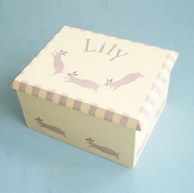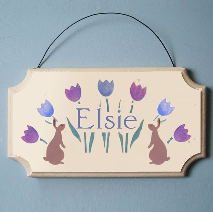 A great Christening or birthday gift, this personalised door hanger/plaque is decorated with adorable rabbits and pretty tulips in soft pastels. It will be an appealing feature in a child's nursery.