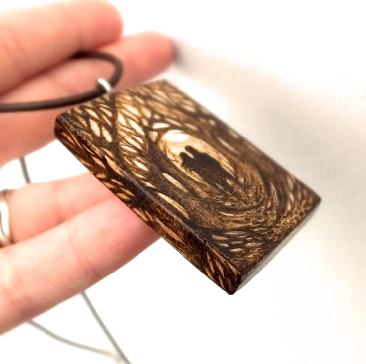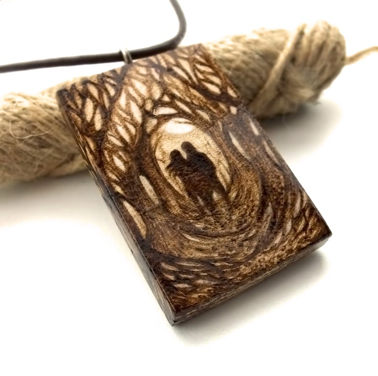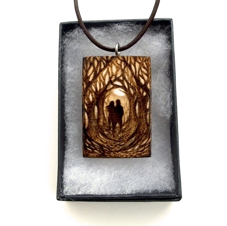 A gorgeous chunky wood pendant, with a romantic couple in a forest or woodland setting, burned into the front and roots, trees and branches reaching round the sides and base. All burned into the wood using pyrography - wood burning. Great for a nature lover, new couple or for a wood (5 years) anniversary gift.