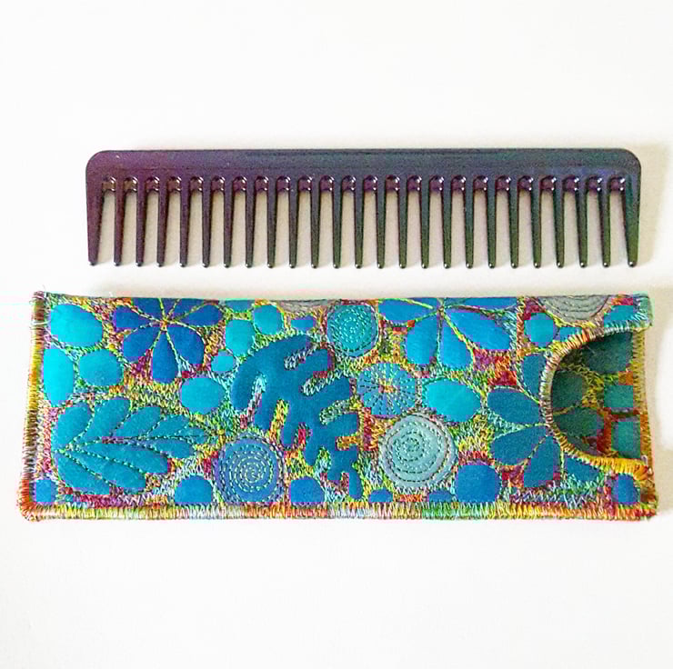 This is a handmade machine stitched fabric hair comb sleeve and comb. The comb has beautiful petrol colours to it, I have bought this in especially as it seemed to match my work so well. It is a large wide tooth comb.