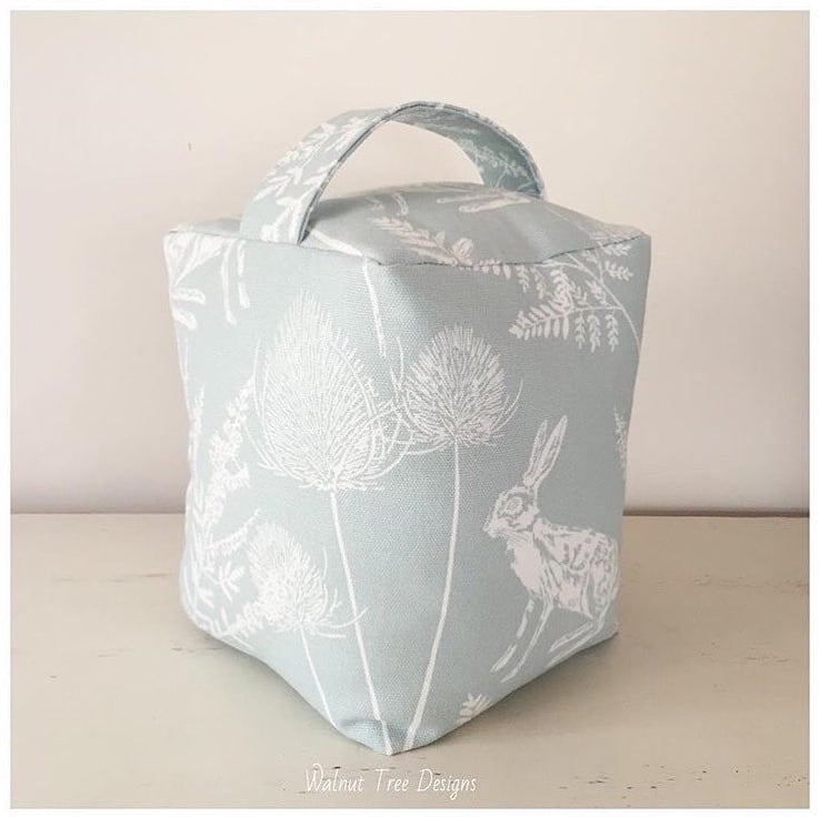 Doorstop made from fabric featuring a hare in its natural environment.