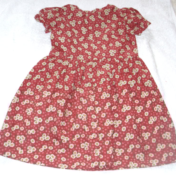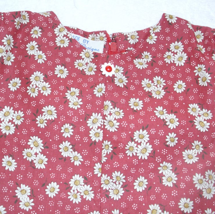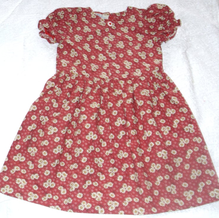 a pretty cotton summer dress with white daises on a red background with back zip and daisy button at front neck, for ages 18 months to 2 year old.