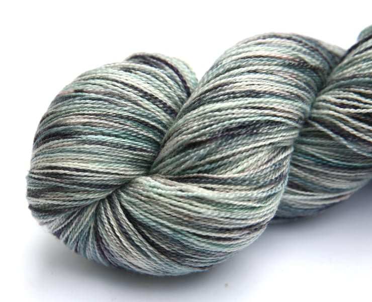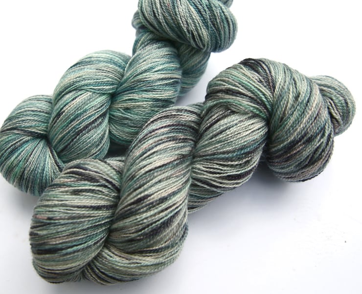 Off-white (undyed) with greys, light grey-green and seafoam. This lustrous, lofty, silky-soft yarn should make beautiful lace projects. There is one skein left, as shown in the first photo and front of the second photo. Photographs have been taken and edited in bright natural light.