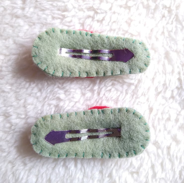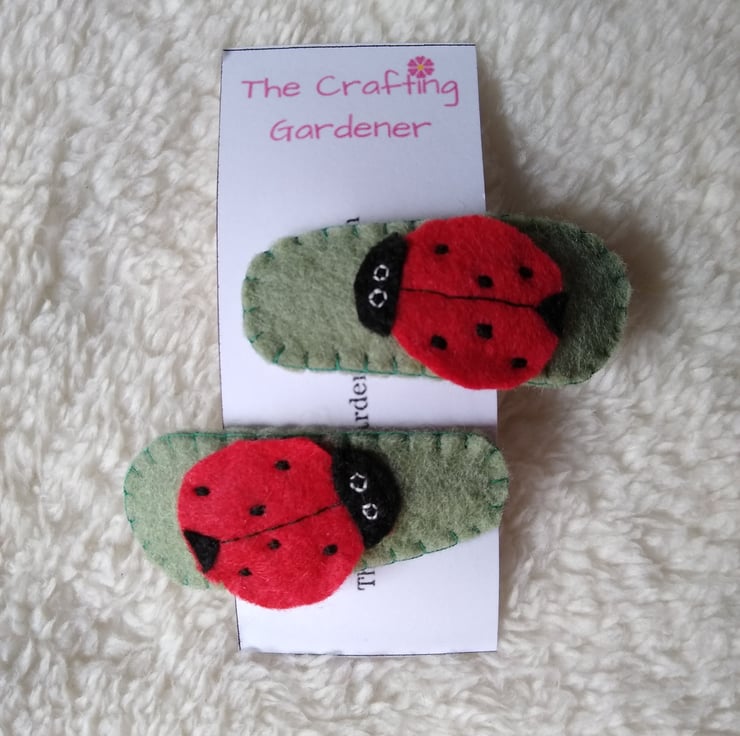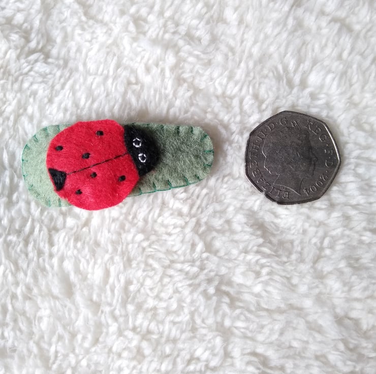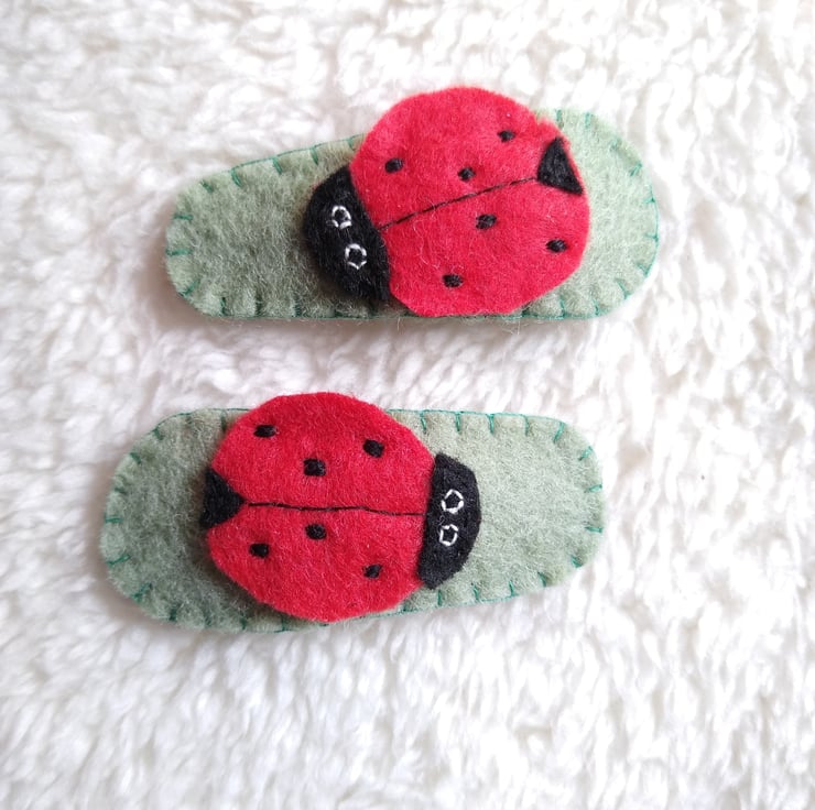 This listing is for a pair of hair clips, each ladybug is hand-cut and stitched by me from red acrylic felt, and is sitting on a mossy green 100% wool felt backing (colours may vary slightly in shade)