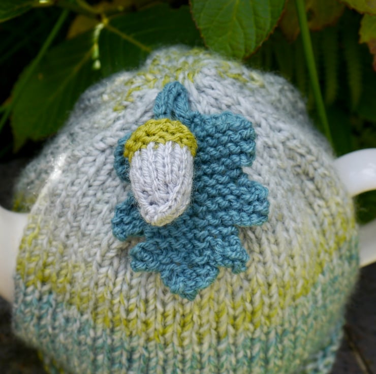 A hand knitted autumn themed tea cosy made with a lovely chunky marble yarn in shades of teal, grey and lime. I have attached a knitted teal oak leaf and grey and lime acorn which complement the tea cosy. It will fit a standard 4-6 cup teapot and is fairly stretchy, so will fit many different designs of teapot.