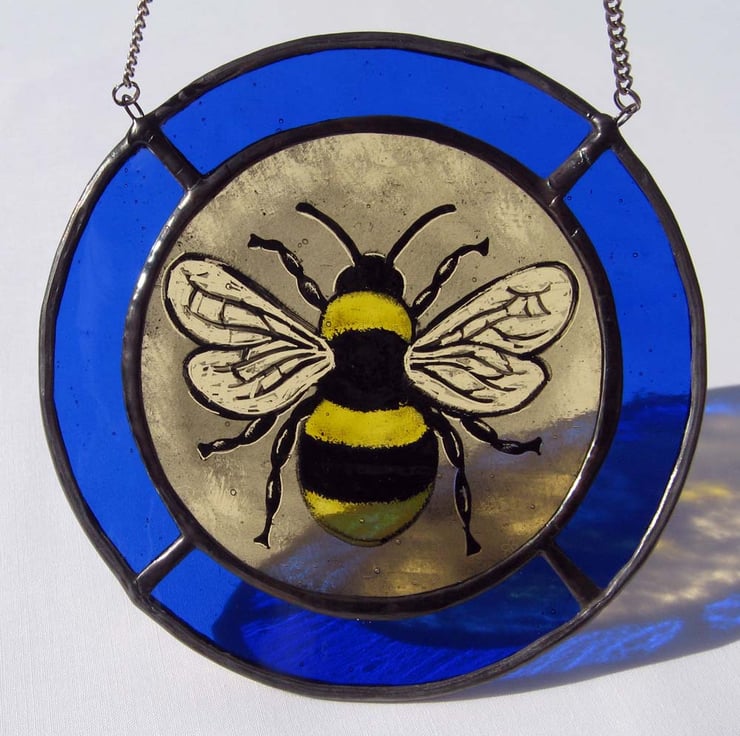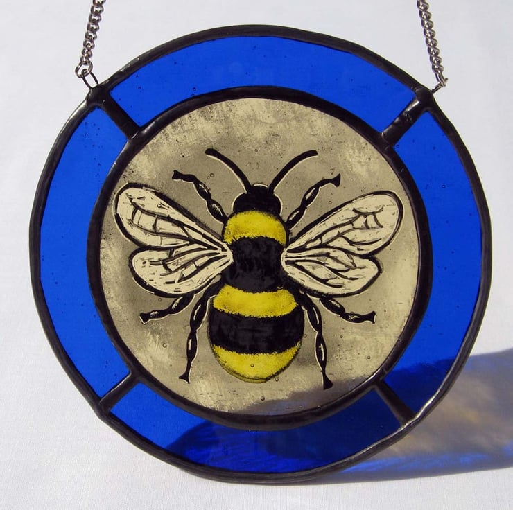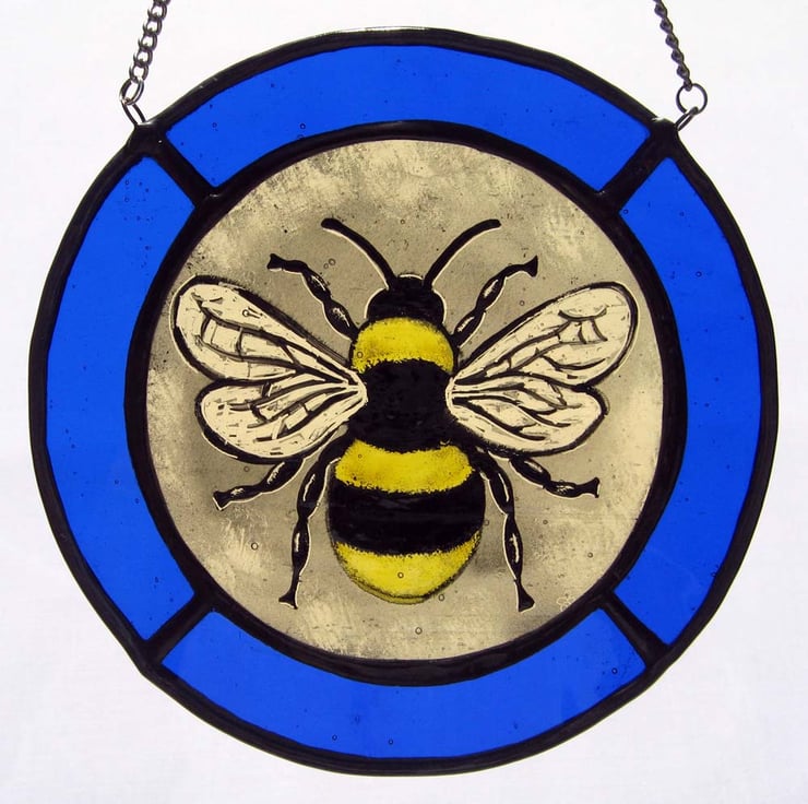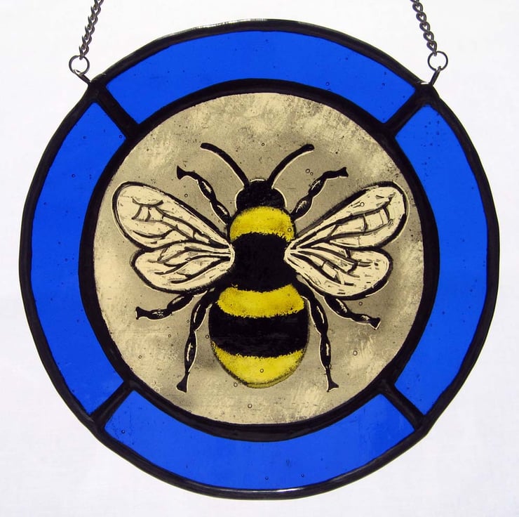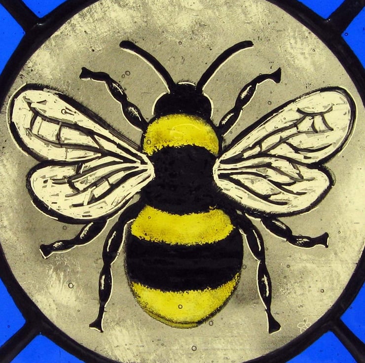 Created using traditional stained glass techniques and materials this bumblebee image has been hand painted onto light amber, antique style glass and fired in a kiln at high temperature making the image permanent and enduring.