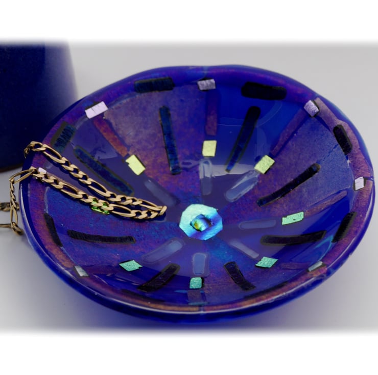 This is fused glass bowl, twice fired to very high temperatures in my kiln, first to fuse all the glass together as a flat circle, 2nd to slump it over a little mould into a dish.
