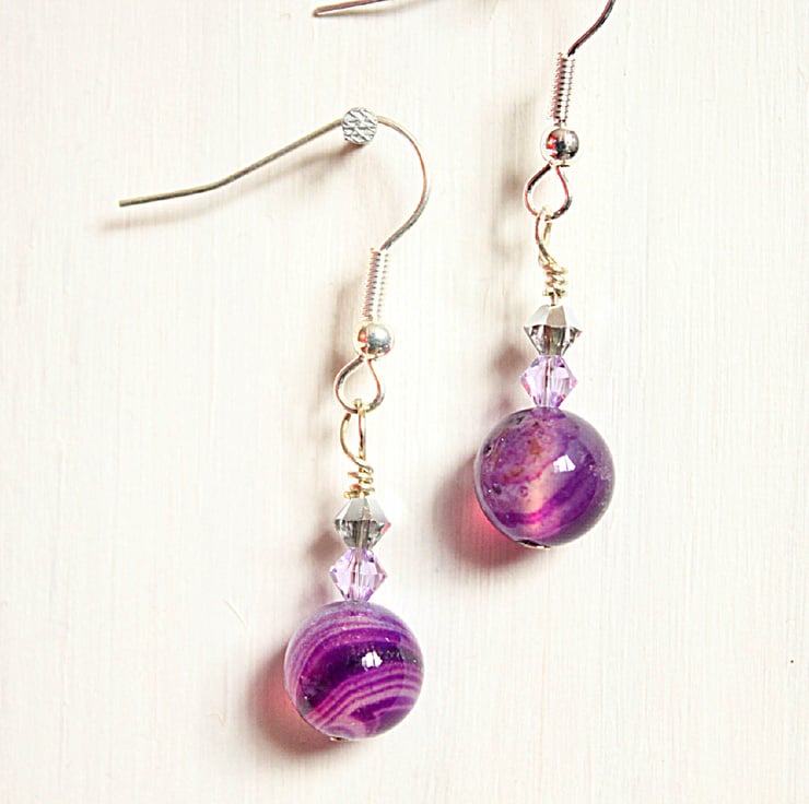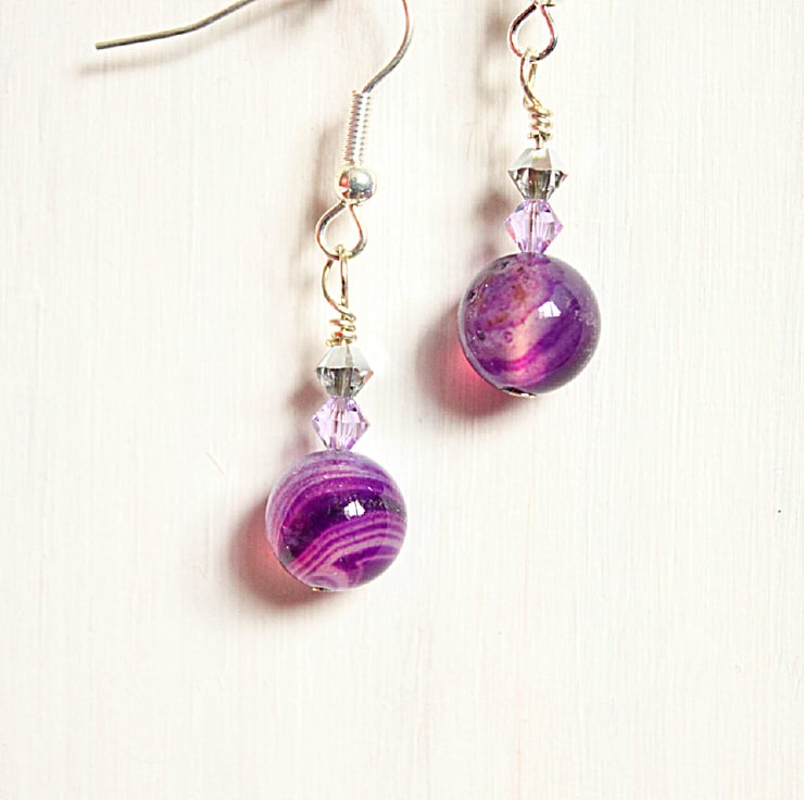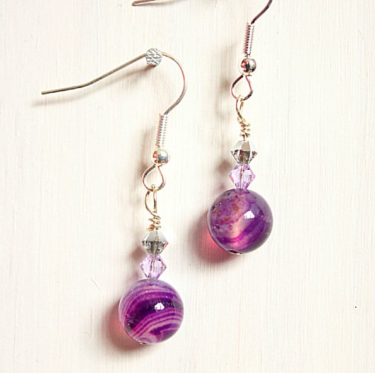 Pretty dangle earrings made from an 8 mm light purple banded agate bead, with two Swarovski Elements crystal bicones (one light purple, one Crystal AB) for added glitz. The overall effect is elegant and simple.