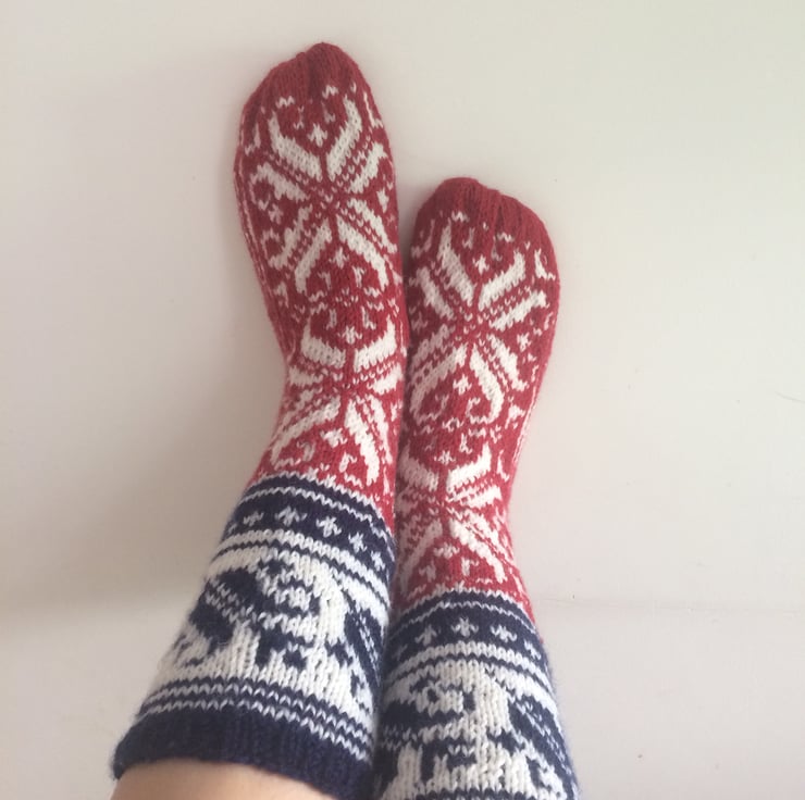 Medium-length socks with intricate Scandinavian pattern, red, blue and white wool.