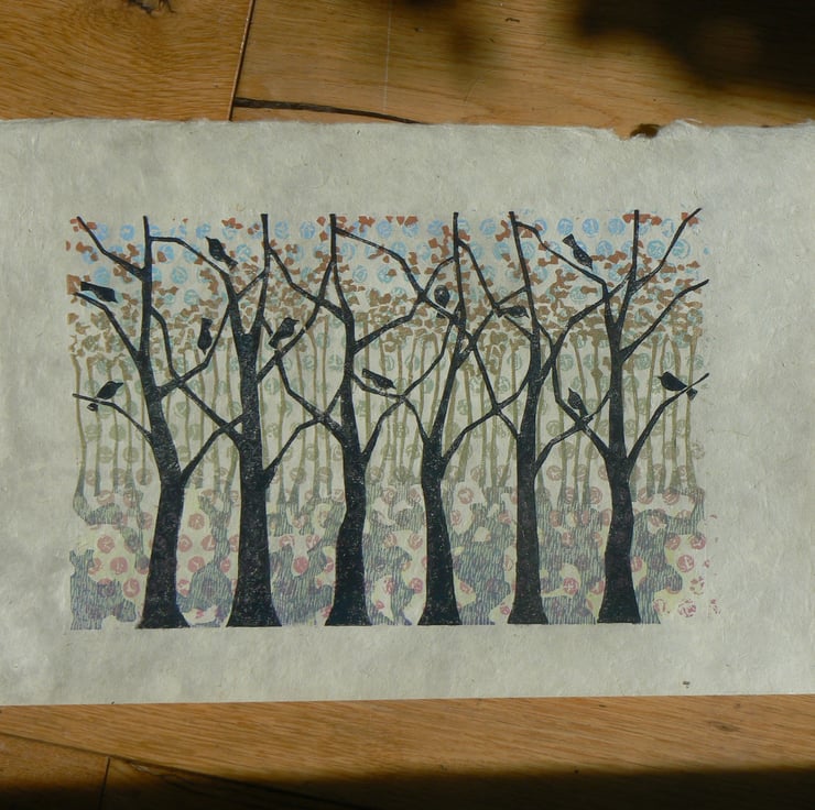 The image is printed in three layers, the base layer being a monoprint using bubblewrap which gives an even pattern over which the colour varies to add the summer sunlight. The second layer is a linocut with a background designed to give a sense of depth, and the final layer of linocut provides the foreground silhouetted as the sun shines through.