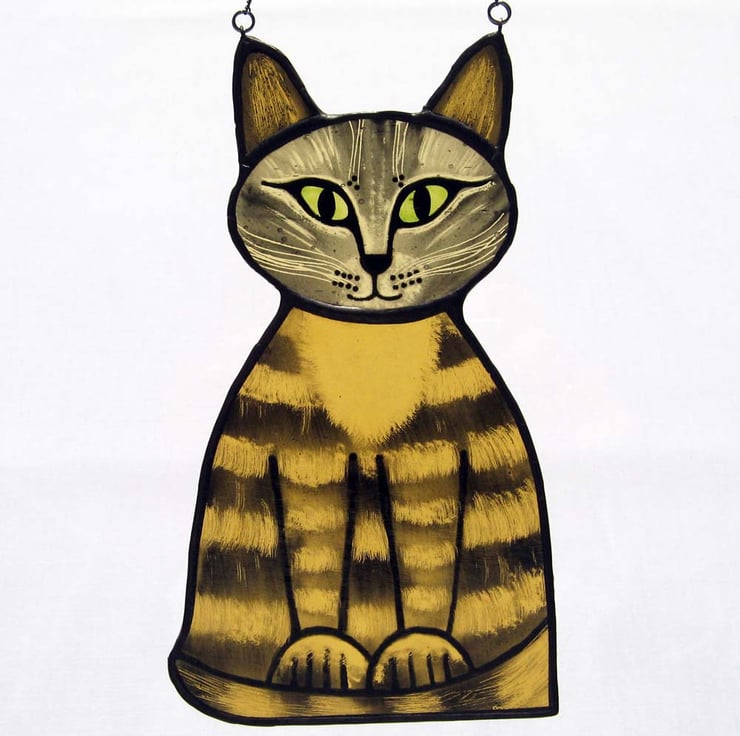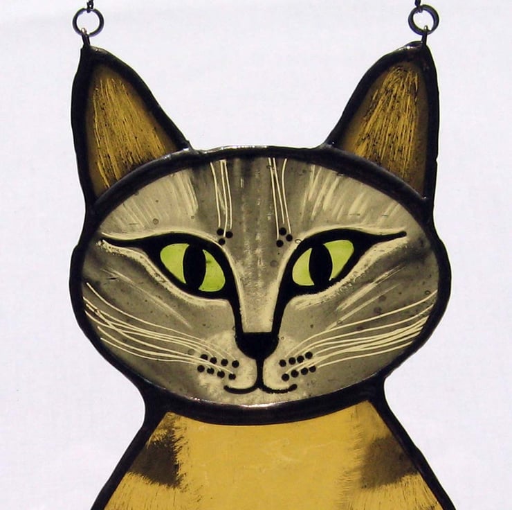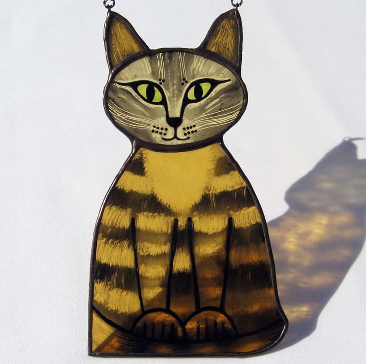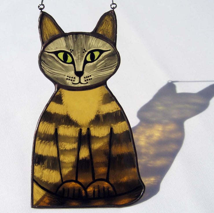 Created using traditional stained glass techniques and materials this amber cat light catcher has been hand painted onto antique style, amber glass and fired in a kiln. The detailed line and shading paint is fired first and in a second firing a touch of colour enamel is added for the cats eyes. At high temperature the paints fuse together with the glass making the image permanent and enduring.