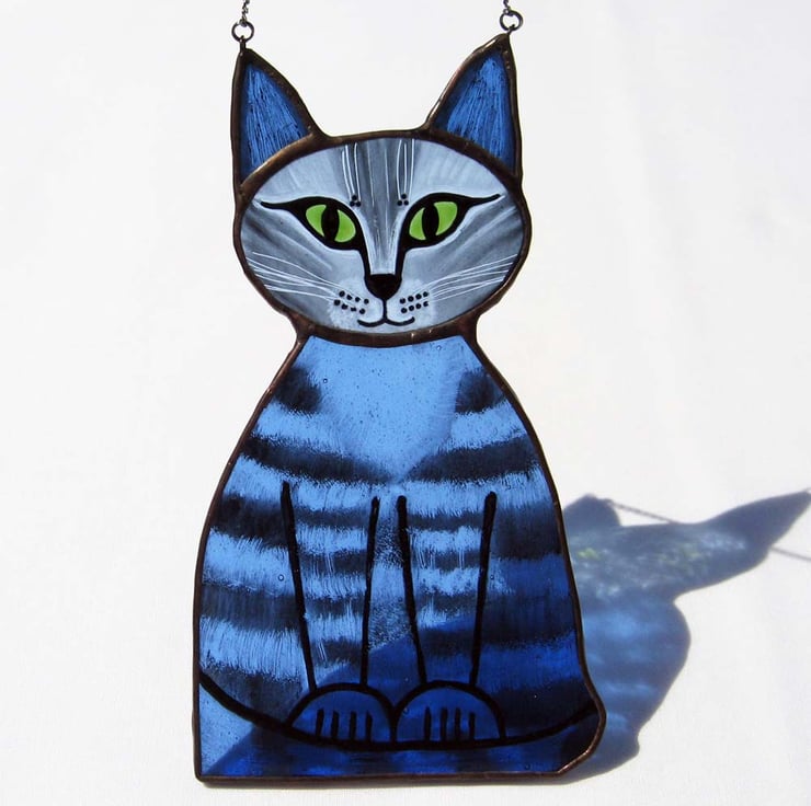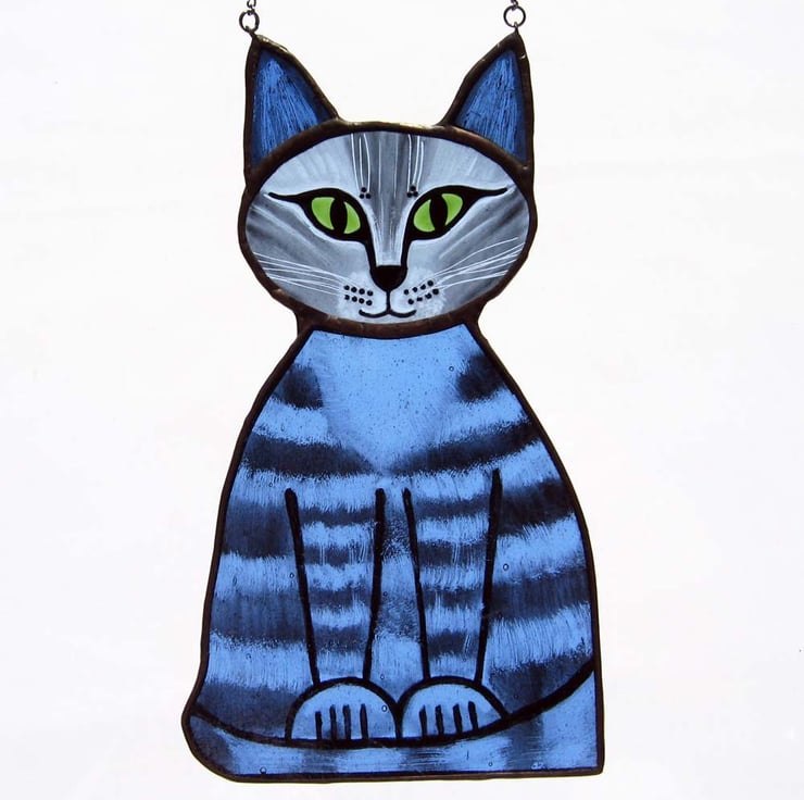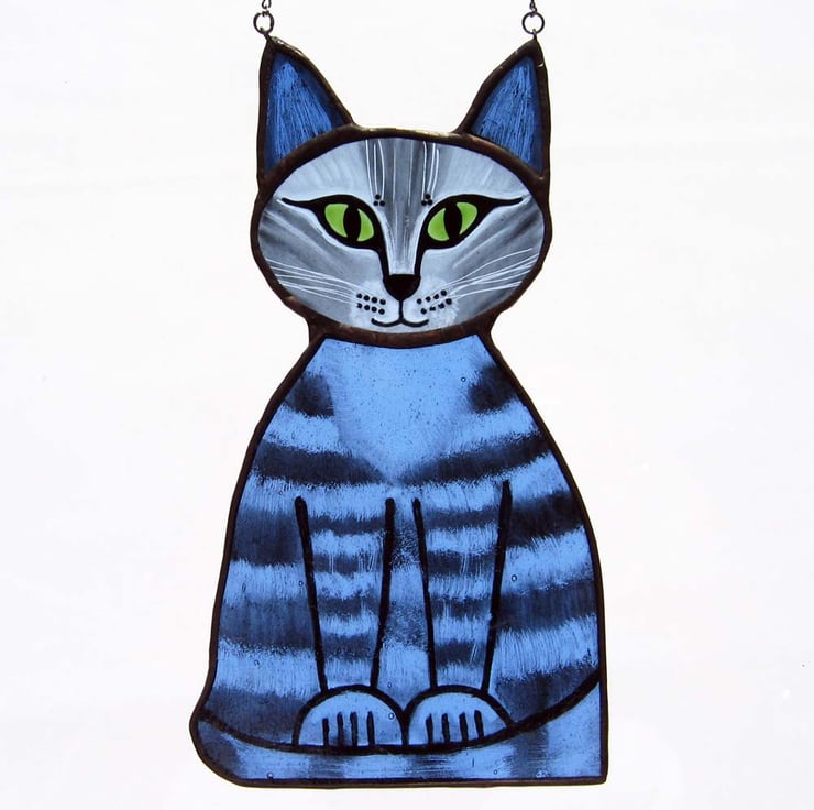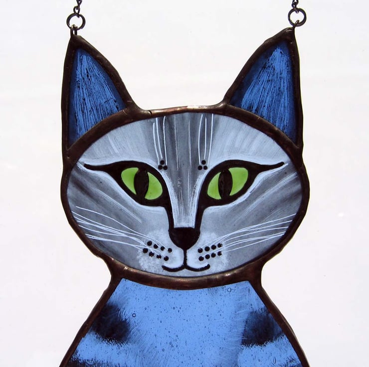 Created using traditional stained glass techniques and materials this blue cat light catcher has been hand painted onto antique style, blue glass and fired in a kiln. The detailed line and shading paint is fired first and in a second firing a touch of colour enamel is added for the cats eyes. At high temperature the paints fuse together with the glass making the image permanent and enduring.