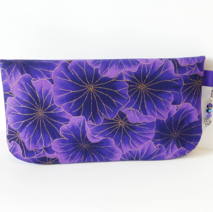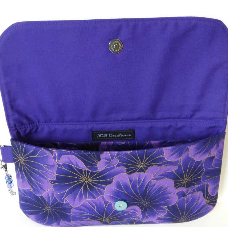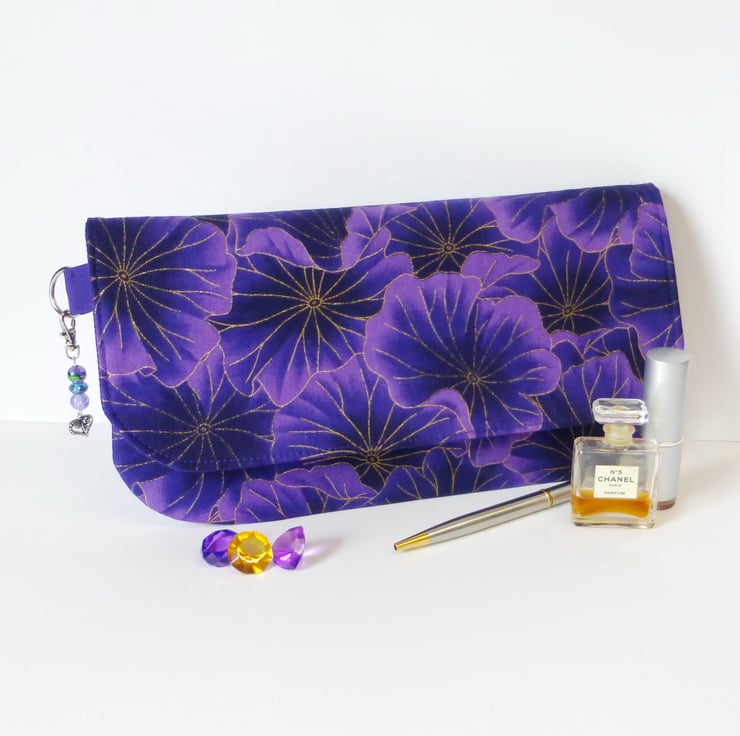 This is a lovely clutch bag made in a purple floral cotton print fabric, with metallic gold coloured highlights.