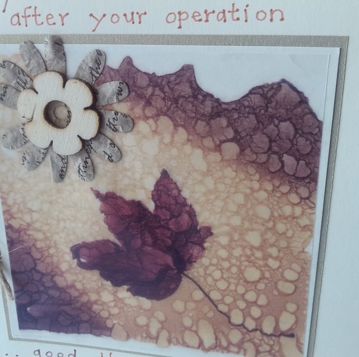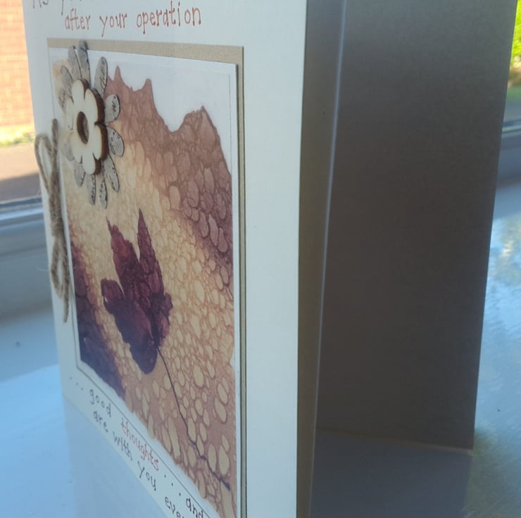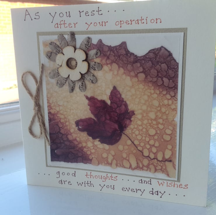 A completely handmade and uniquely designed card. Consisting of a pretty !eaf printed vellum which has been mounted onto cream card, gold card and then onto quality cream card. Embellished with printed paper and wood flower and a hessian bow. The words ' as you rest after your operation, good thoughts and wishes are with you every day'