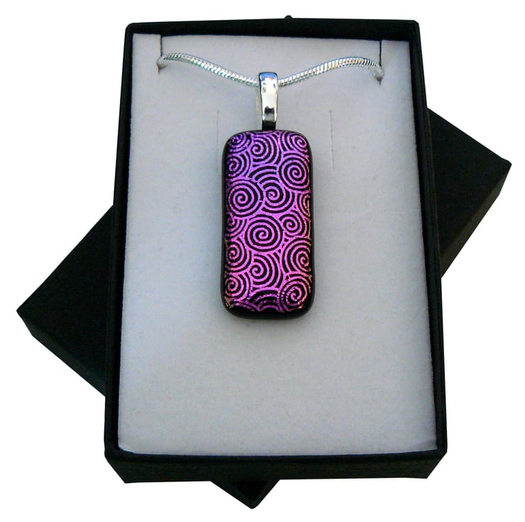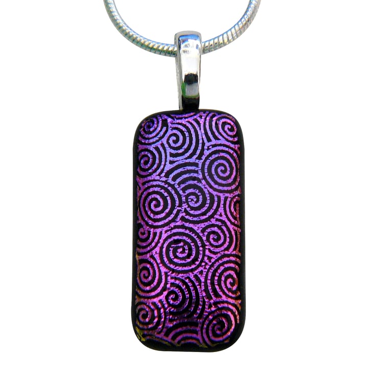 Fused Glass 'TWIRL' Pendant. I made this little pendant by layering vibrant blue/pink dichroic glass onto a black fusing glass background. The two layers of glass were fused in my glass kiln until the two pieces became one. I then laser engraved the 'TWIRL' pattern onto the pendant.