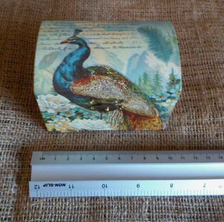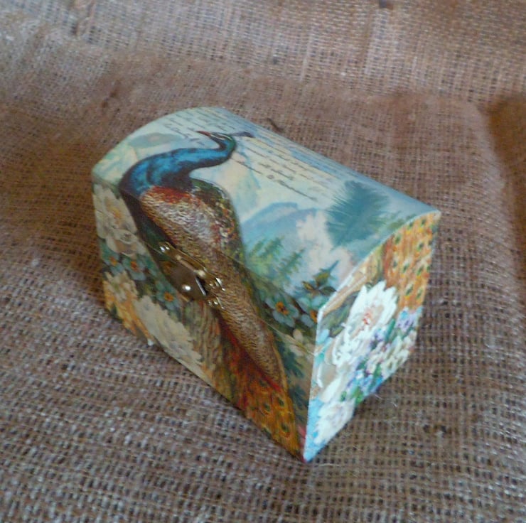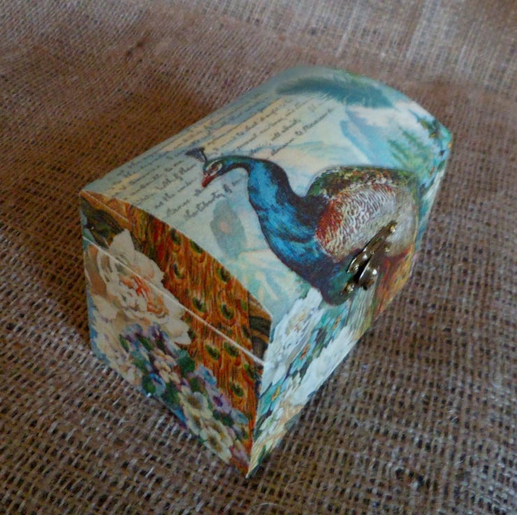 This is a dear little dome-topped chest with feet and a clasp that I have decorated with a beautiful peacock image from a napkin.