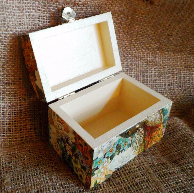 I love this napkin and wanted to decorate a small box where I could wrap the peacock over the top and front, and eventually found this little chest that was just the right size.
