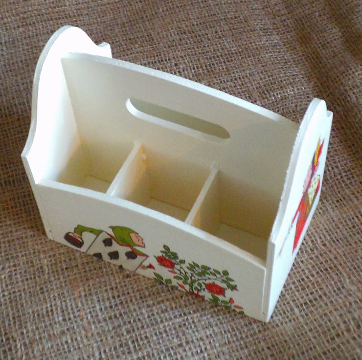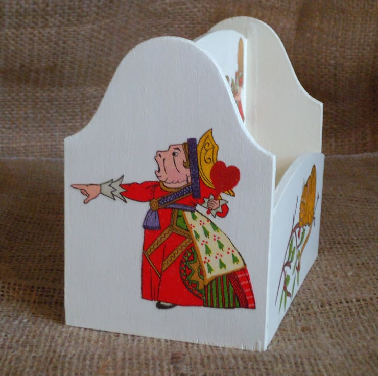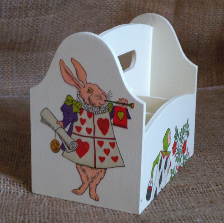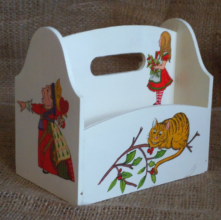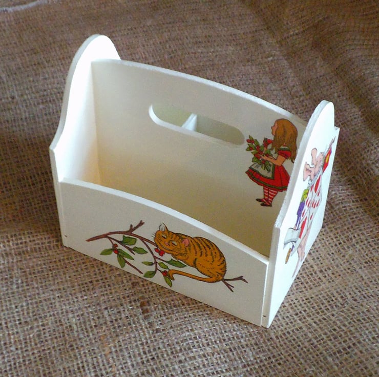 A selection of images from Alice In Wonderland are shown on this dear little rustic feel, cream coloured caddy.
