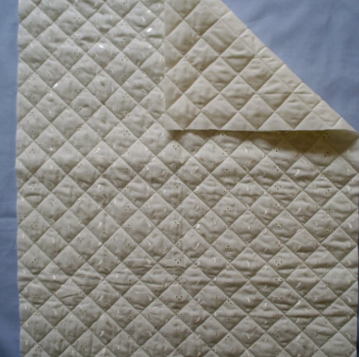 Quilt backing cut to 47cm x 62cm which fits one of the small buggy blankets in my patterns when a 1cm hem is turned all round. There are instructions in the pattern for how to attach the backing to the finished blanket. The quilting has cotton broderie anglaise fabric on one side and plain on the other with a polyester wadding in between. Washable on 40C cycle when attached to the blanket.
