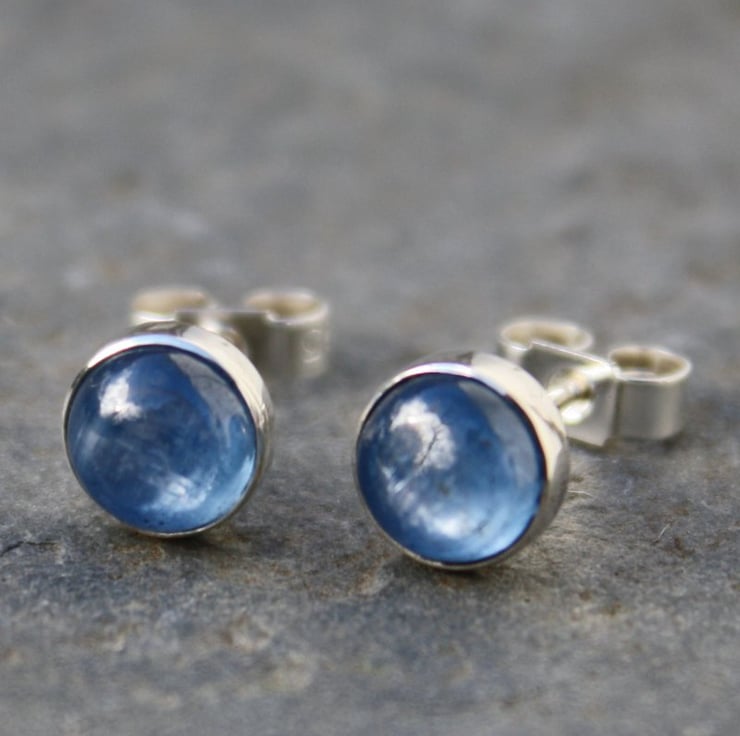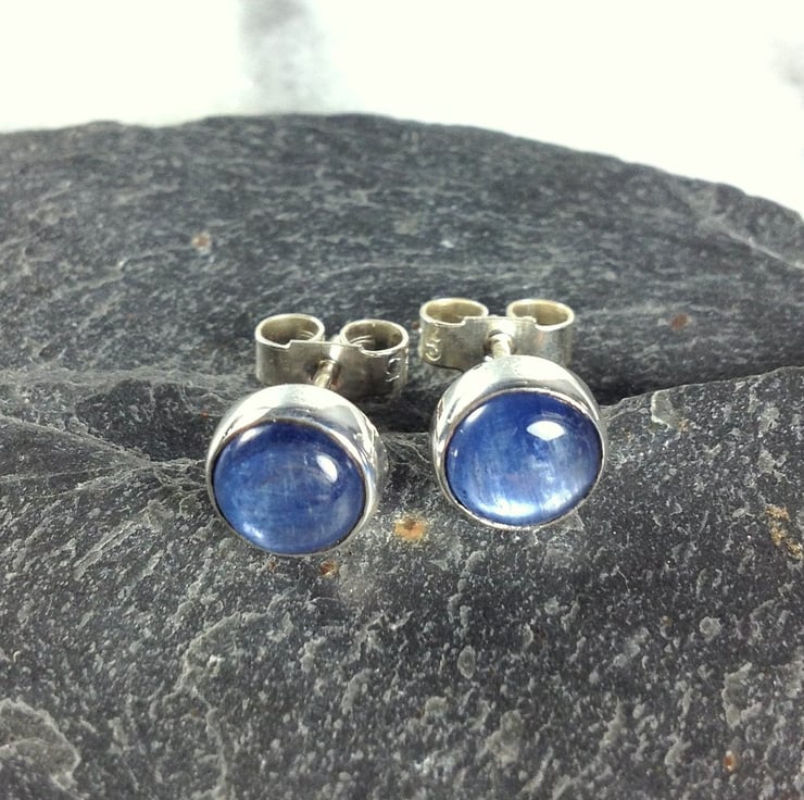 The kyanite cabs measure 6mm diameter .The silver has been polished to a bright finish.