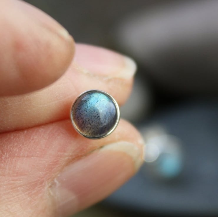 Simple small sterling silver stud earrings set with striking washed denim blue kyanite cabochons.