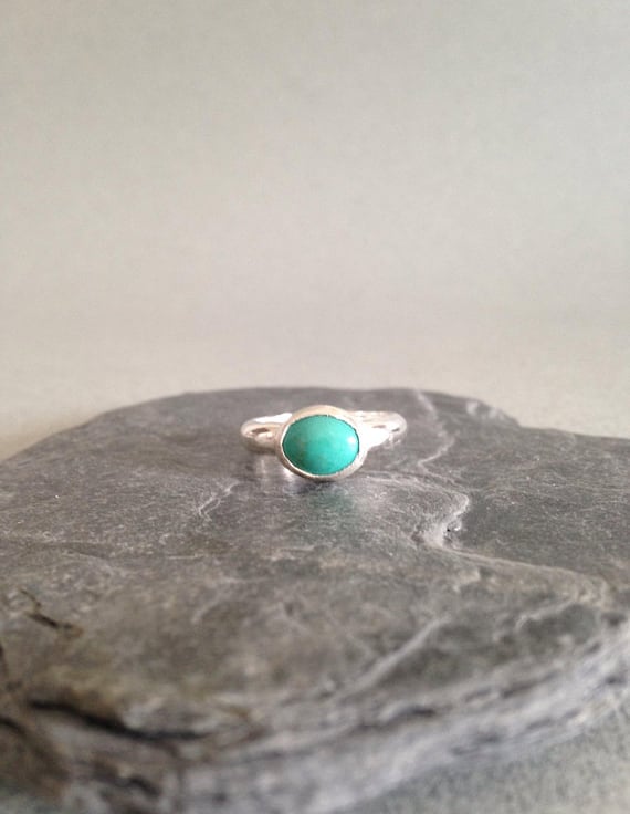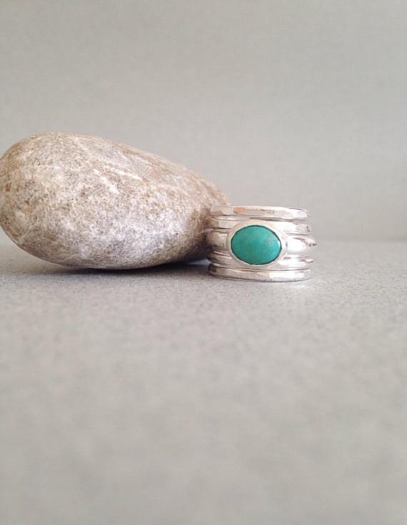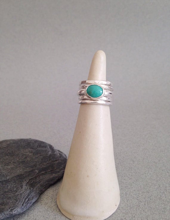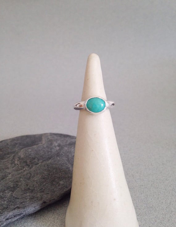 This listing is for one genuine turquoise ring. The stone is roughly 8x10mm and it is set on a beautiful sterling silver D shaped band. The band is 4mm wide and it is a lovely solid silver ring. It can be worn alone or with other stacking rings, as shown. Please message me if you want to order silver stacking rings in addition to the turquoise ring.