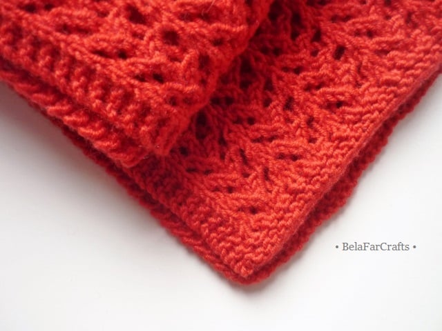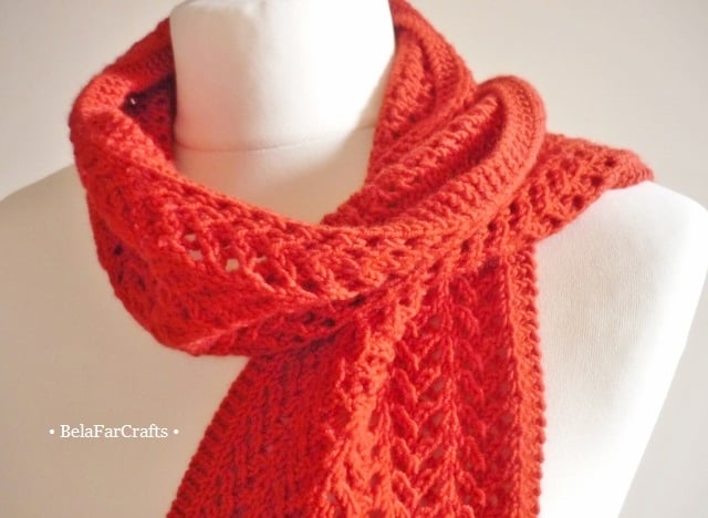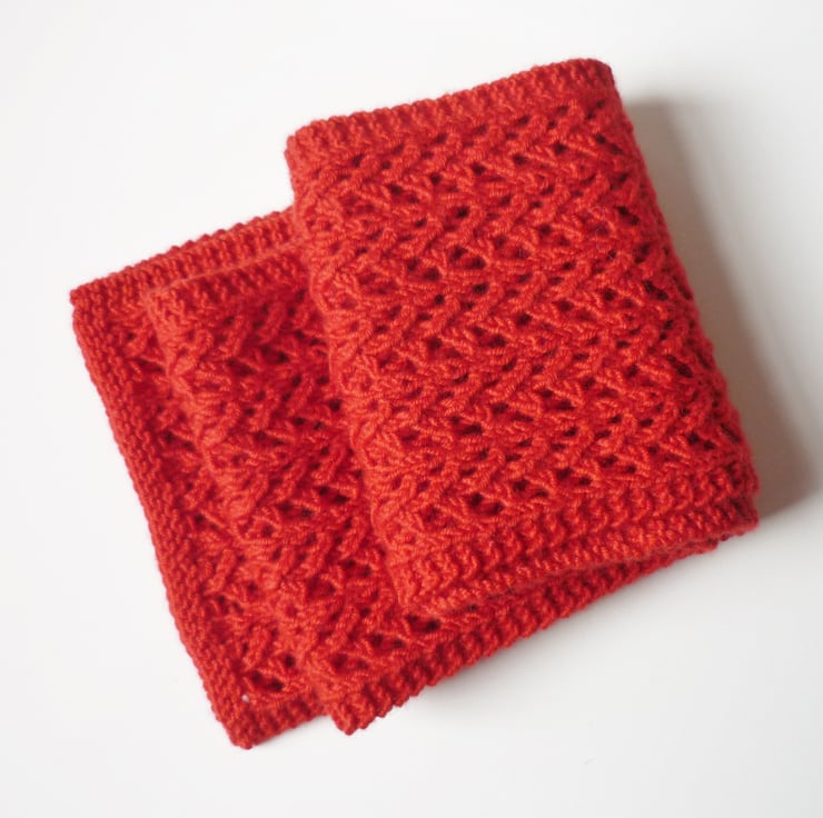 I used good quality merino wool which is breathable and very soft against the skin. The bright colour is between red and orange. It measures about 13cm x 100cm (5in x 39.5in).