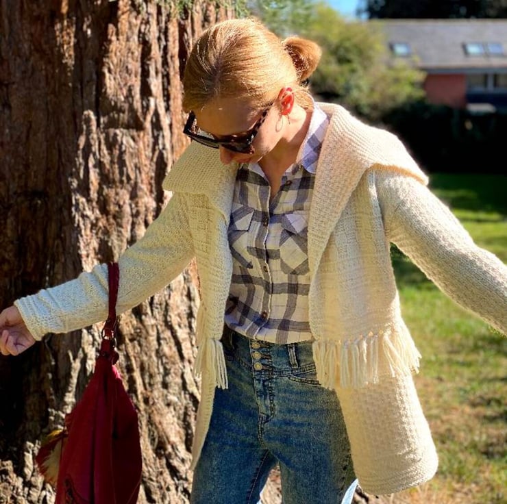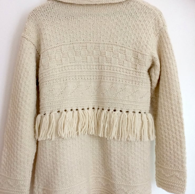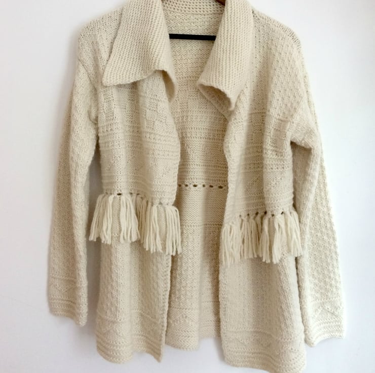 Hand-knitted chunky jacket/ cardigan with textured patterns and fringing in off-white colour.