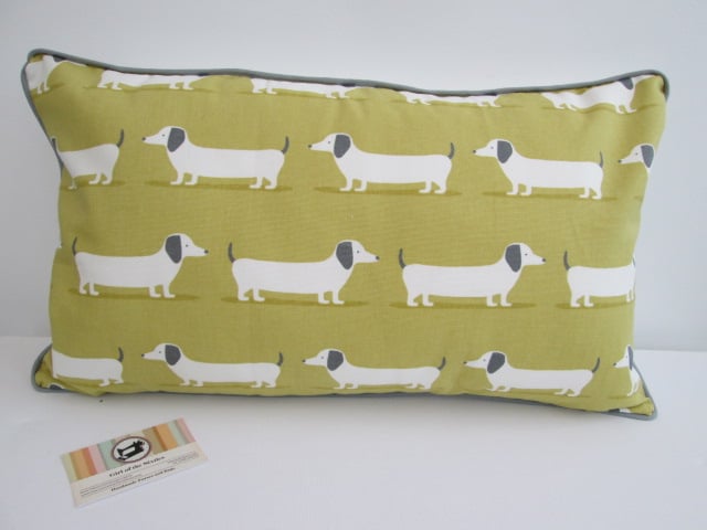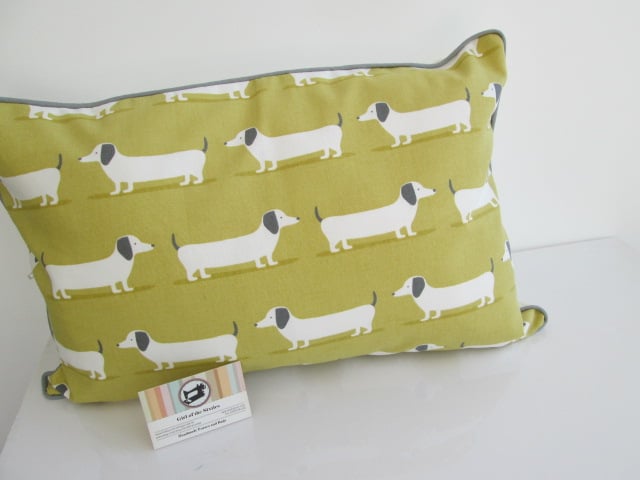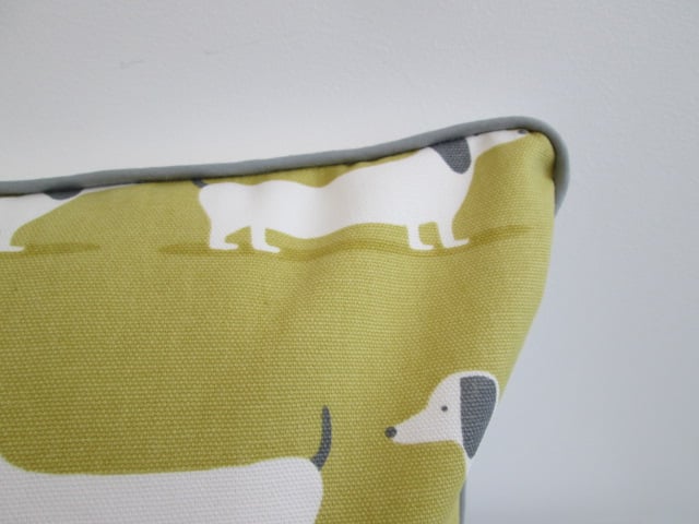 Dachsunds fabric cushion with back zip and grey piping.