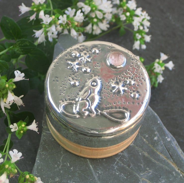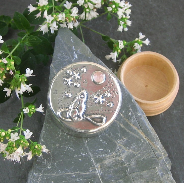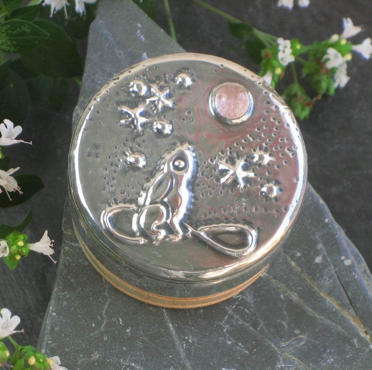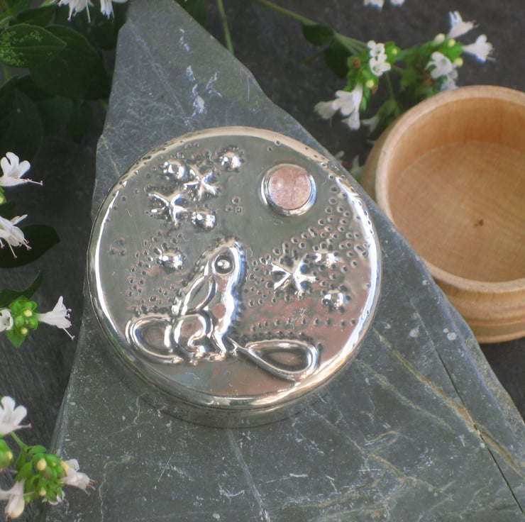 This tiny wooden box has been transformed with a lid of lead-free modern pewter, set with a genuine rose quartz cabochon. The mythical hare of pagan legend gazes up enraptured at the moon.