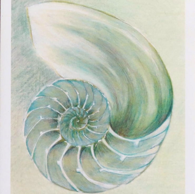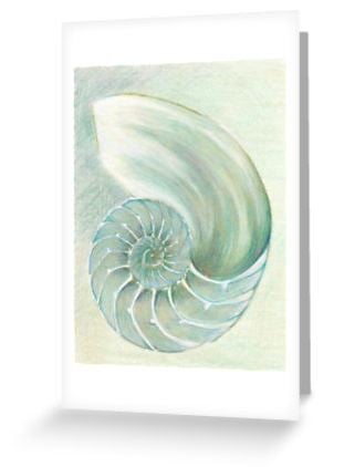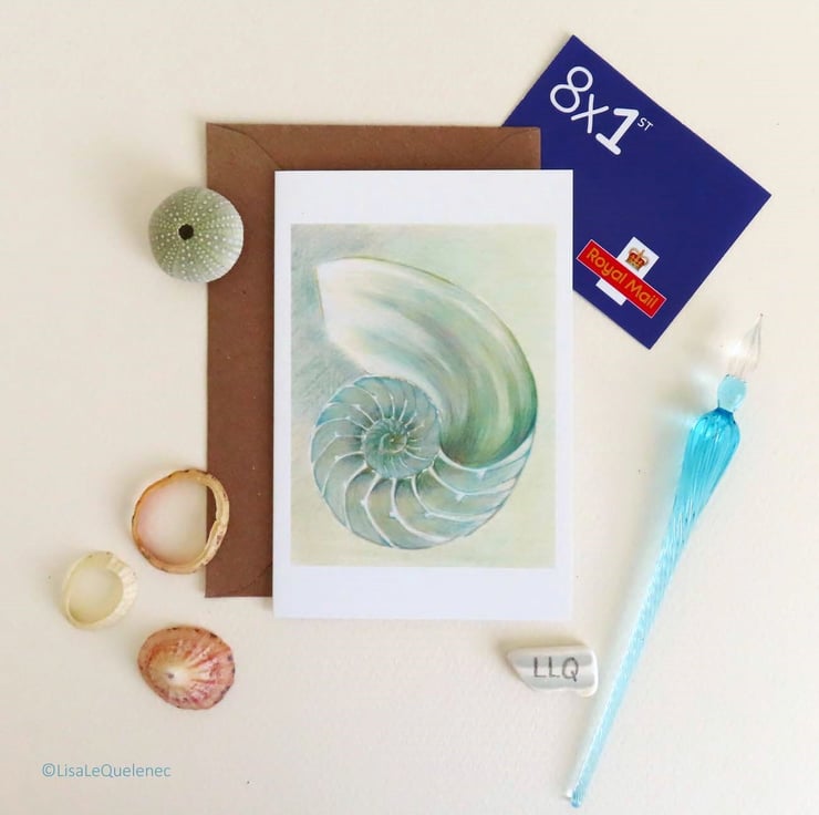 A blank greeting card reproduced from my original mixed media painting of a chambered nautilus shell cross section. Each card measures 6x4 inch (10x15.5cm).