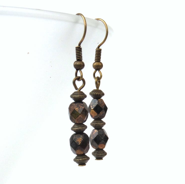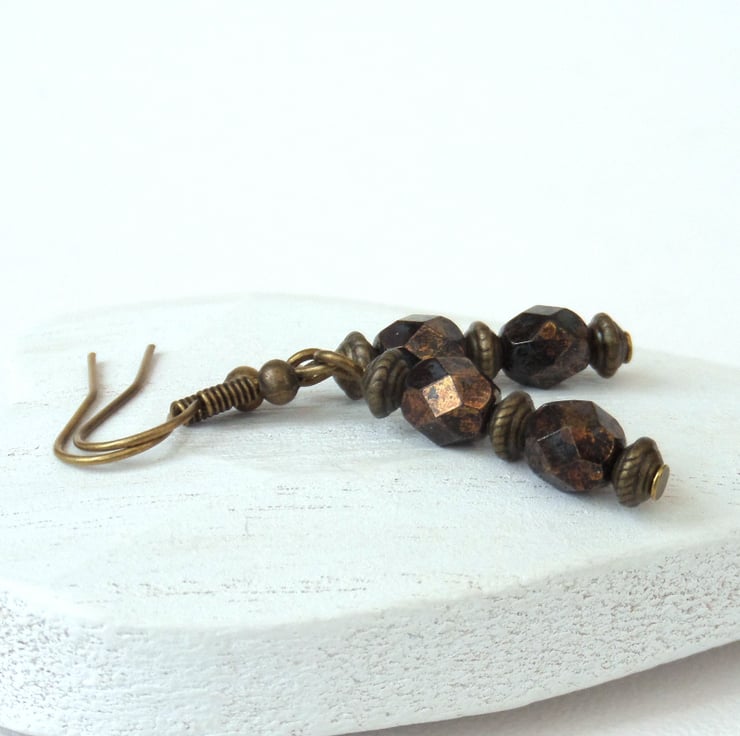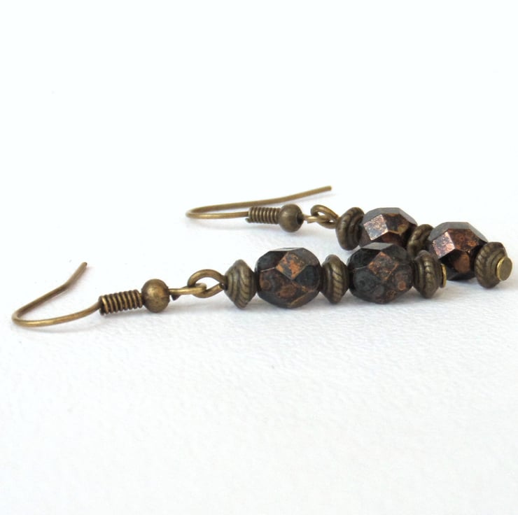 A pair of bronze earrings, made with two mottled brown crystals and little bronze beads.