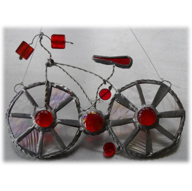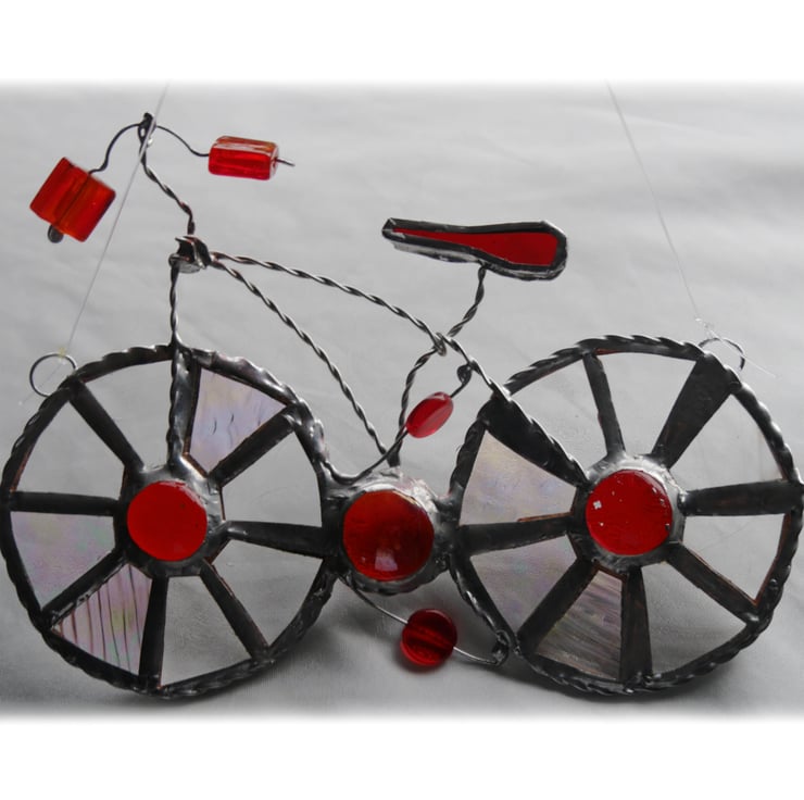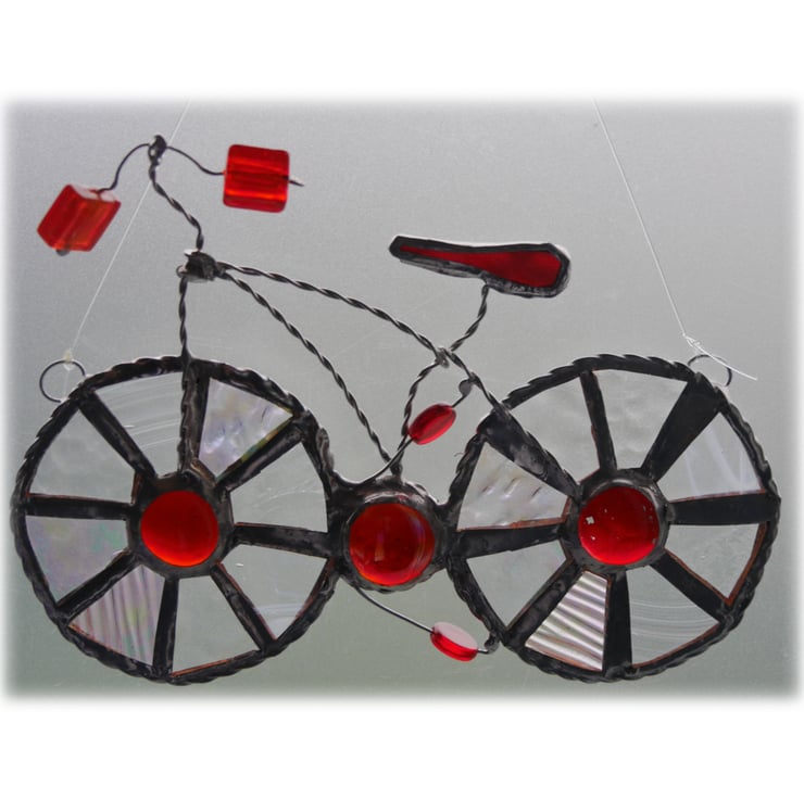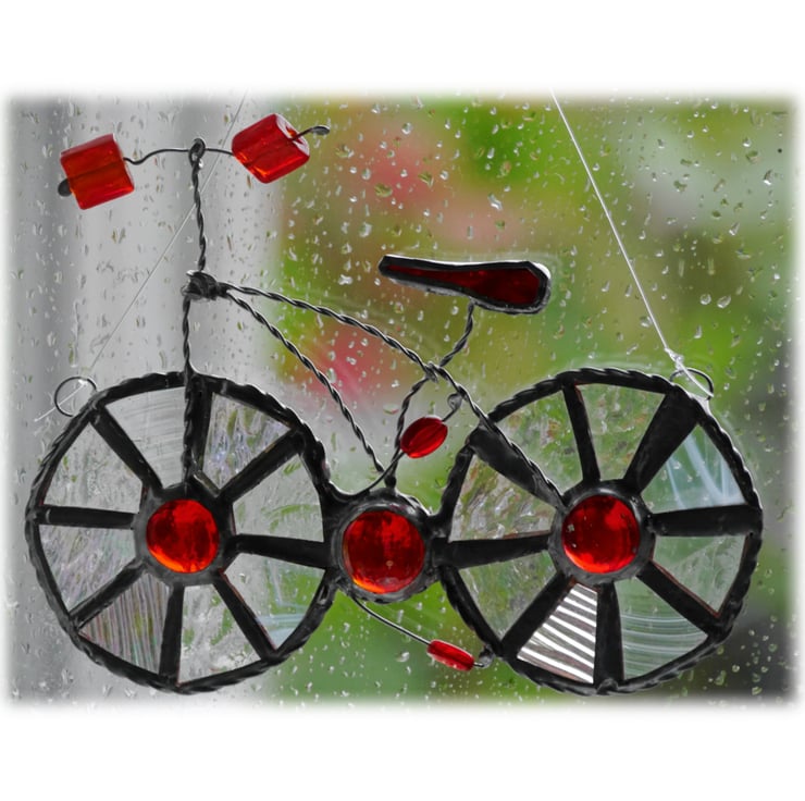 The bicycle hangs from a strong plastic line and looks quite amazing hanging in the window.