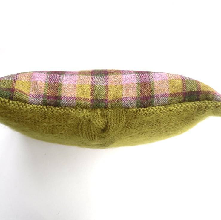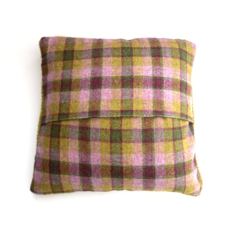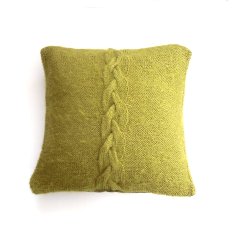 Hand knitted green pillow. Beautiful cushion cover knit in 100% mohair with a big feature cable / braid running down the centre front. The back is finished in a well coordinated tartan in pink and green.