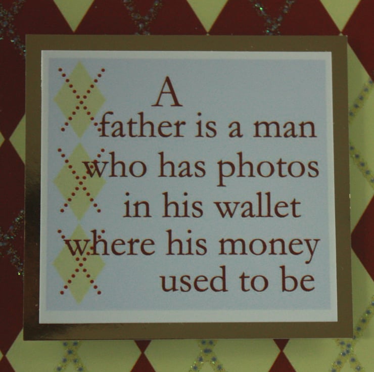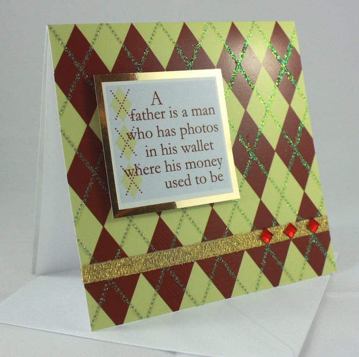 Square Father's Day card featuring a quote about fathers, layered over a coordinating diamond patterned, glittered card. The quote is layered onto gold card and onto the base card using pads to give a 3d appearance.