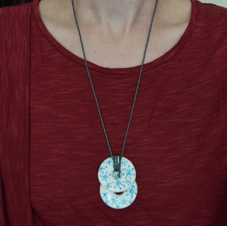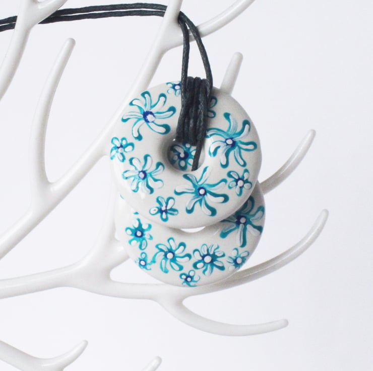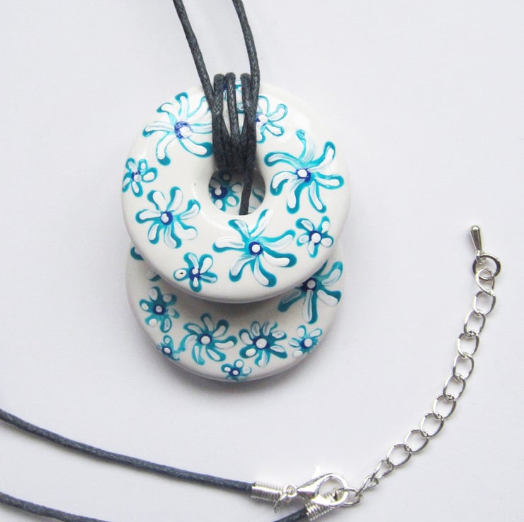 Hand Painted Blue and White Floral Pattern Double Stacked Donut Shaped Ceramic Pendant on Grey Cord with Lobster Clasp and Extender Chain
