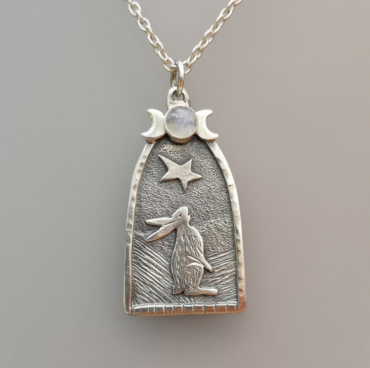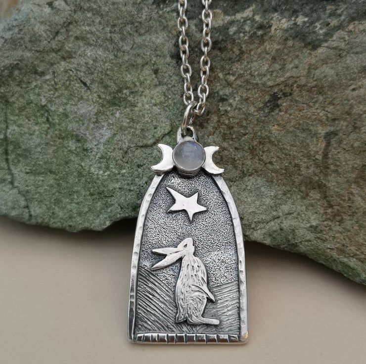 This hare features a lot in my work and was inspired by a medieval church hare. I am fascinated by the mythology that surrounds these creatures and love combining them with the moon. Who doesn't love a moon gazing hare? I have created a frame for this little moon gazing hare to sit within. The triple moon symbolizes the different phases in the lunar cycle and is set with a lovely moonstone.