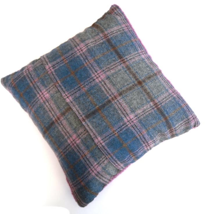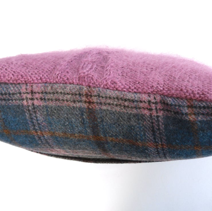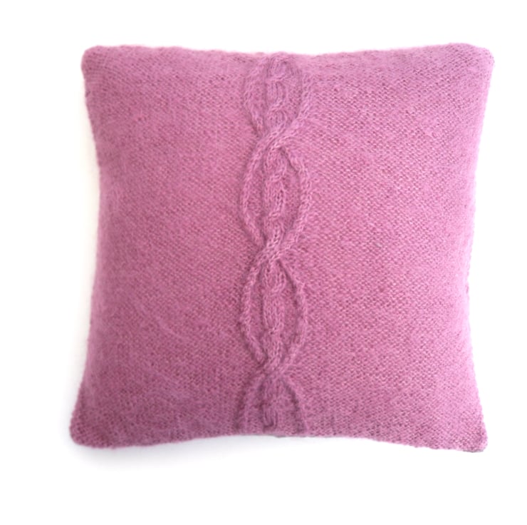 Pink mohair cushion cover. This has been designed by me and hand knitted in soft squidgy mohair with an intricate feature cable / braid down the centre front. This throw Pillow has a wool tartan back with an envelope opening