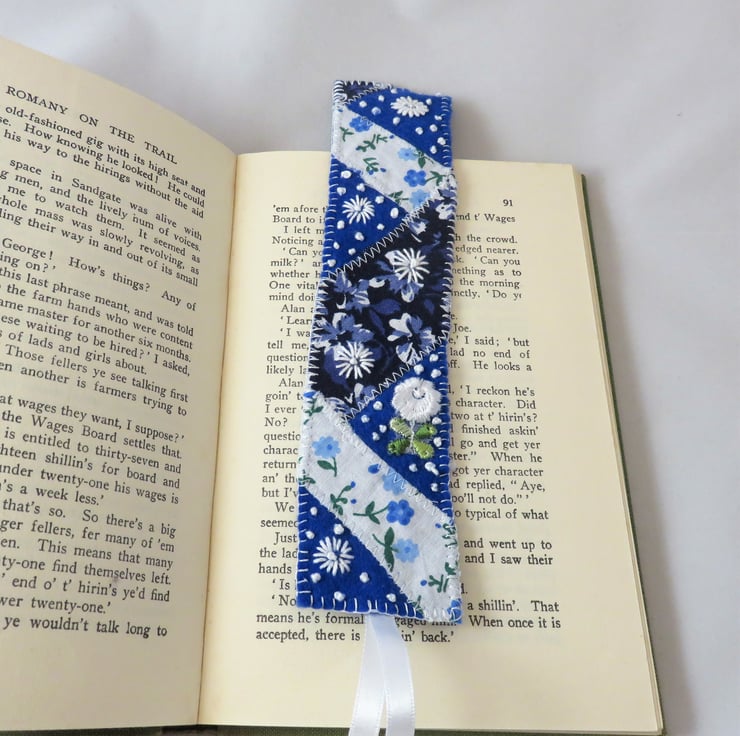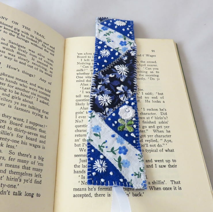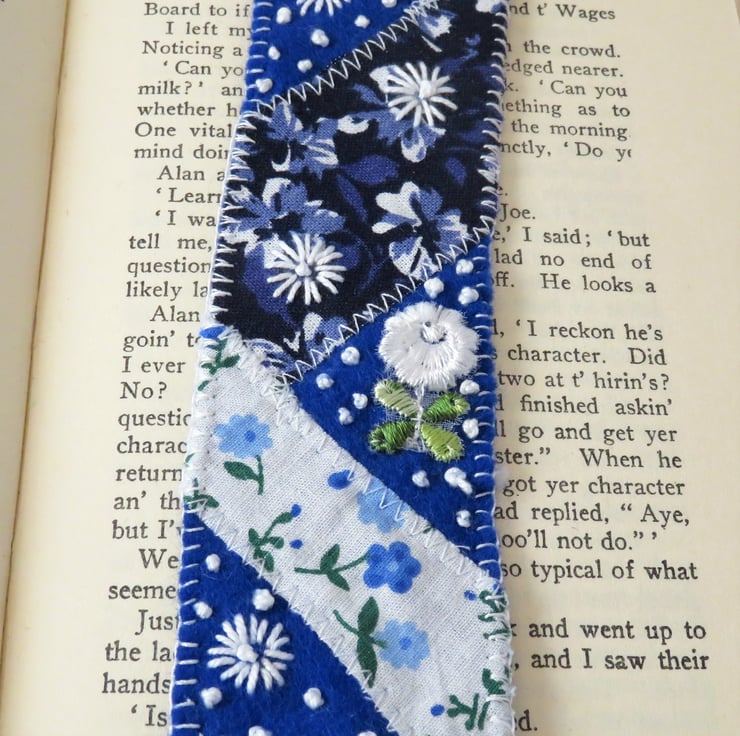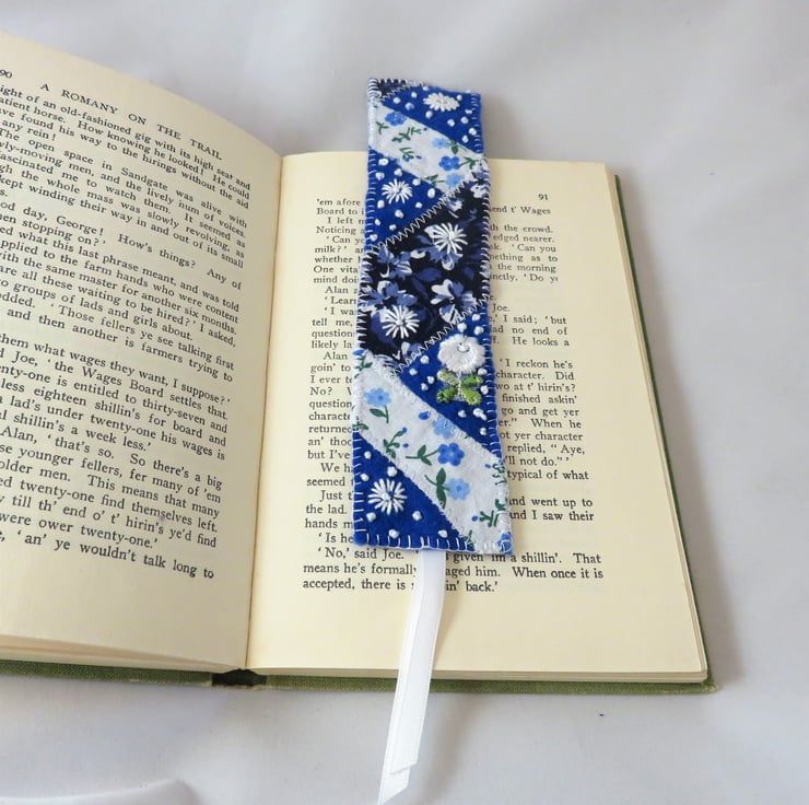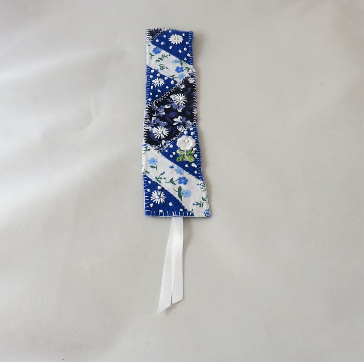 This pretty bookmark is created from scraps of vintage and other printed fabrics, machine stitched to a felt backing in a patchwork, enhanced with trimmings and hand embroidery.