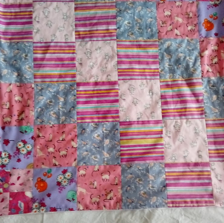 This pretty patchwork baby blanket is made up of squares of cotton fabrics in pink and purple colours in a variety of different designs. It is backed in a baby soft pink fleece with stars and would make a perfect gift for a baby girl.